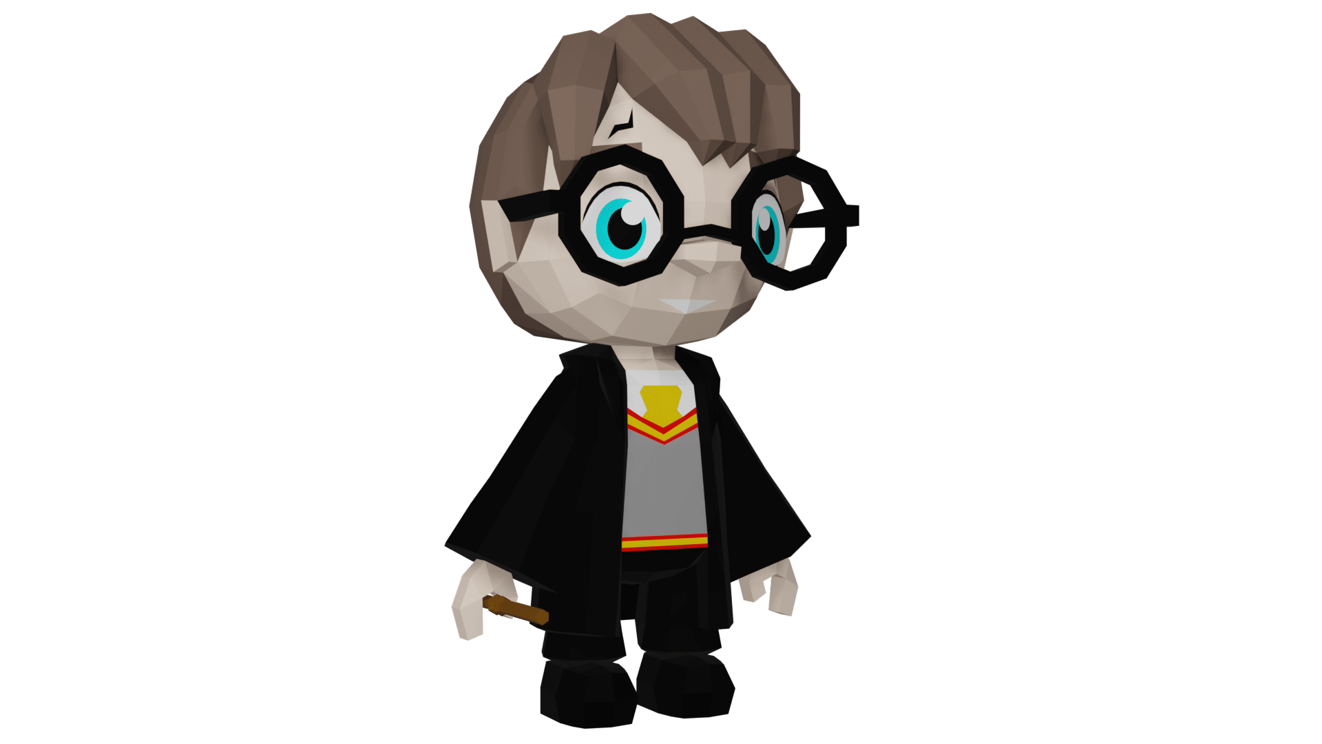 Une figurine low-poly au look iconique : grandes lunettes rondes, cape longue et petite baguette.