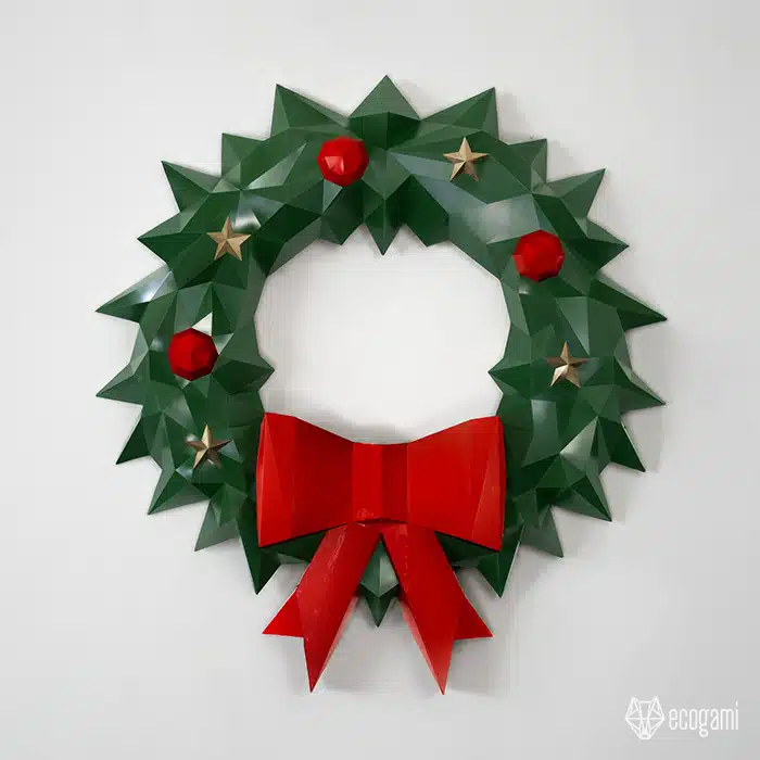 Papercraft de couronne de Noël en origami. Dimensions ajustables, 11 feuilles à imprimer. Disponible en kit digital PDF ou box complète.