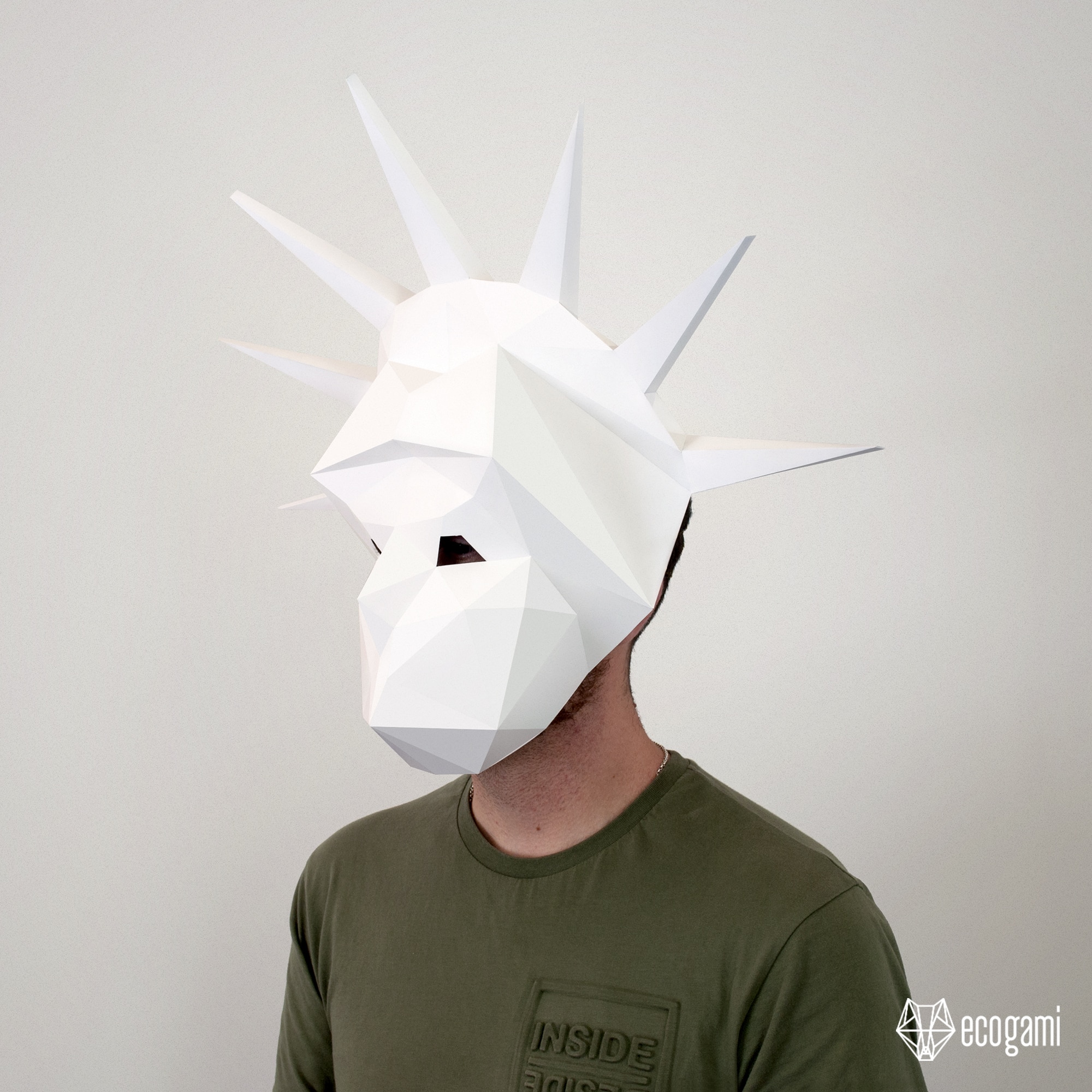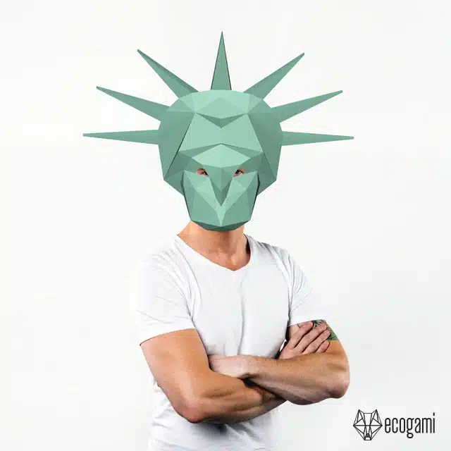 Papercraft masque de la statue de la liberté en origami : Ce masque 3D Low Poly est facile à assembler (niveau débutant à modéré), personnalisable et idéal pour les soirées costumées ou projets créatifs. Dimensions ajustables, 10 feuilles à imprimer. Disponible en kit digital PDF ou box complète.