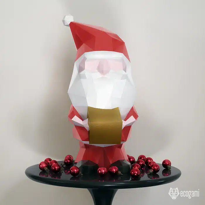 Papercraft de père Noël en origami. Dimensions ajustables, 14 feuilles à imprimer. Disponible en kit digital PDF ou box complète.