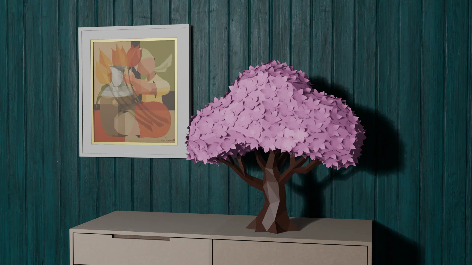 Une pièce low-poly spectaculaire qui évoque la floraison du sakura : feuillage généreux en milliers de pétales stylisés,
