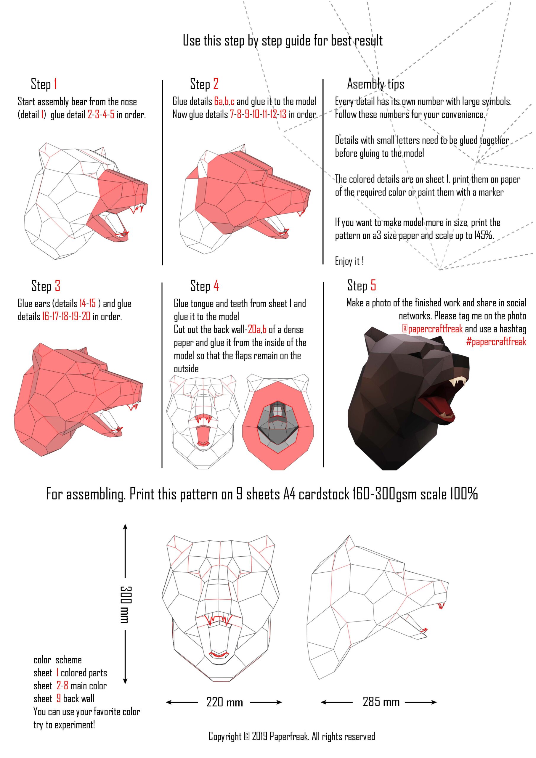 Technische Details des 3D-Papercraft-Bärenkopfes als Trophäe