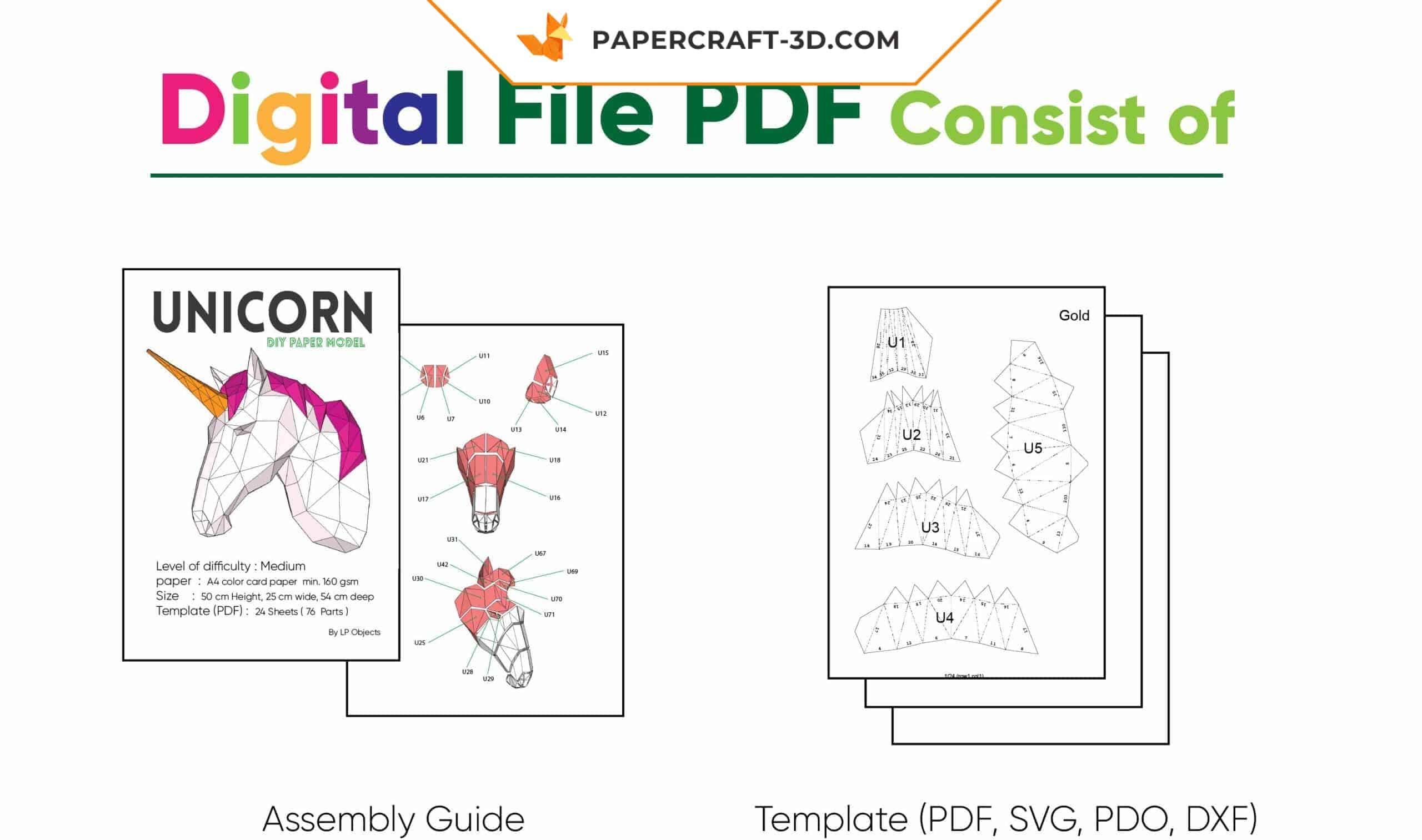 Egal, ob Sie sich für das digitale Papercraft-Kit zum sofortigen Download oder die komplette Box mit allen notwendigen Accessoires entscheiden – unser Einhornkopf in 3D-Origami-Optik passt sich Ihren Bedürfnissen an. Tauchen Sie ein in die faszinierende Welt des Papercrafts und gestalten Sie ein beeindruckendes und modernes 3D-Papierkunstwerk.