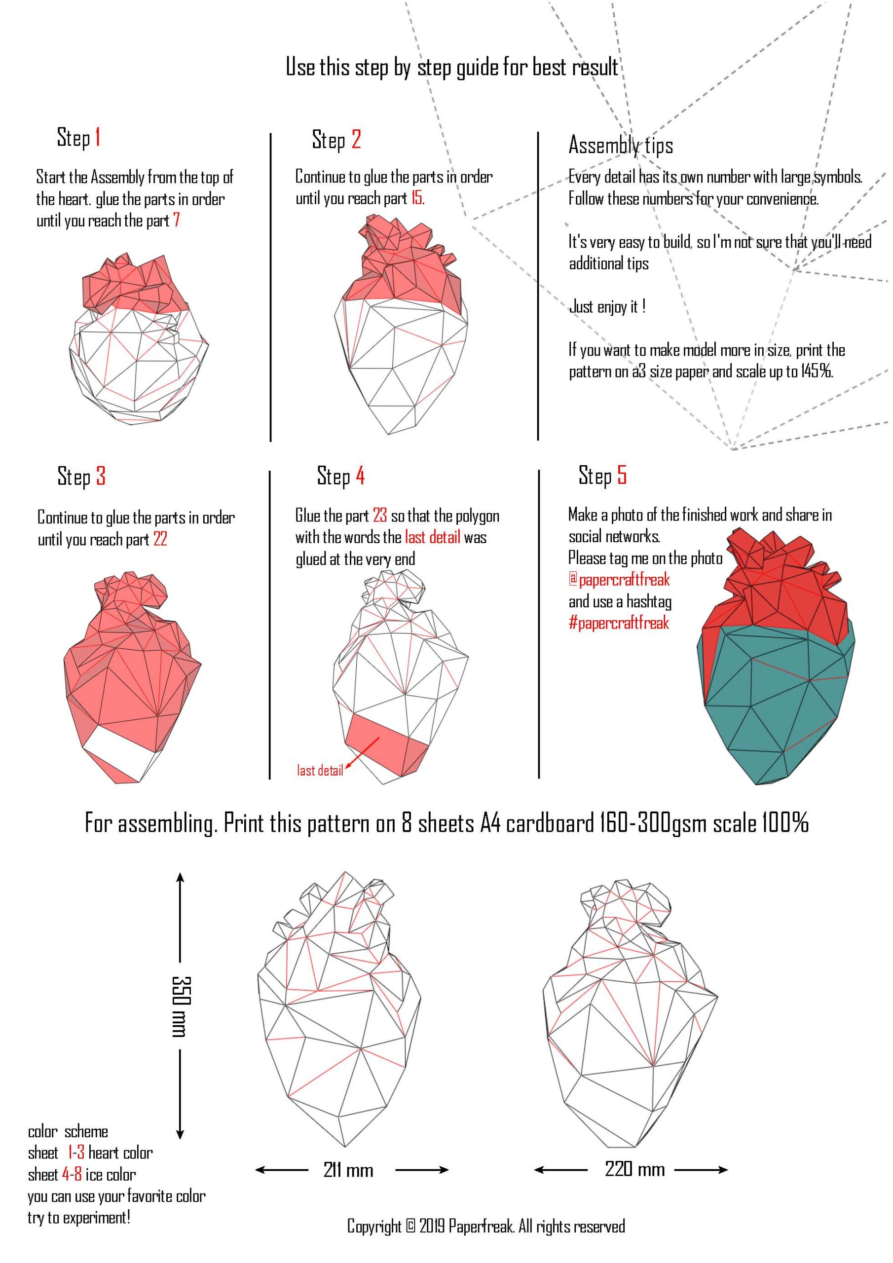 Ein frostiges Herz, das Sie selbst erschaffen können! Stellen Sie sich eine zauberhafte Winterlandschaft vor, in der jeder Atemzug die Zeit zum Stillstand bringt. Mitten im Schneegestöber funkelt ein kristallklares Herz im Sonnenlicht. Mit unserem Papercraft-Kit für ein Eisherz in Origami 3D können Sie dieses magische Kunstwerk ganz einfach zu Hause gestalten! Ob als einzigartiges Dekorationselement für Ihr Zuhause oder Büro, oder als besonderes Geschenk – dieses Modell ist perfekt für alle Kreativliebhaber. Dank der detaillierten Anleitung können auch Anfänger dieses facettenreiche Herz mühelos zusammenbauen.