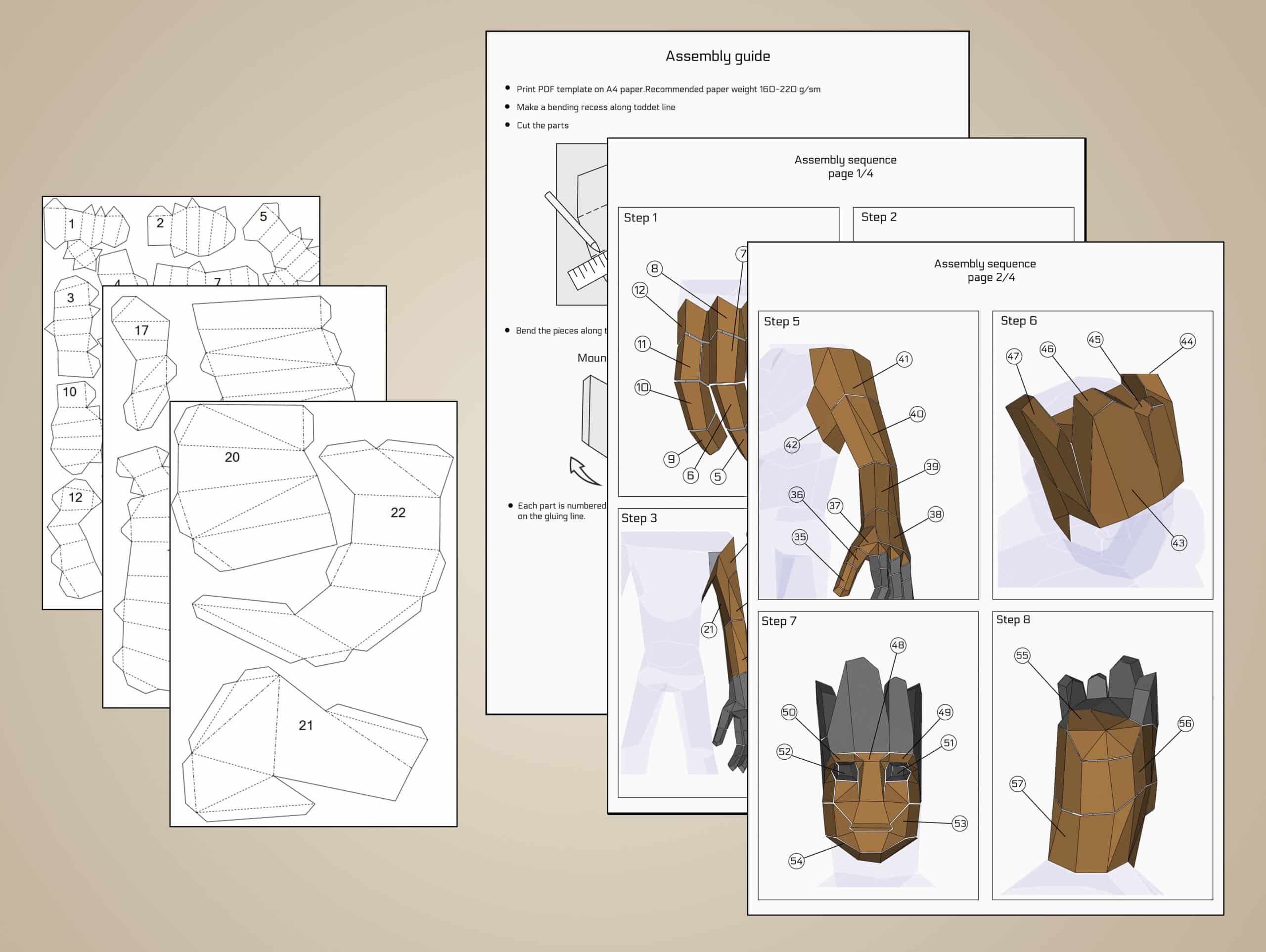 Das Modell erfordert 26 bedruckte Blätter. Nach Fertigstellung misst es 80 cm in der Höhe, 36 cm in der Breite und 20 cm in der Tiefe. Die zum Download verfügbaren Dateien umfassen: Groot Template.pdf, Groot Assembly Guide.pdf, Groot_SVG.zip.