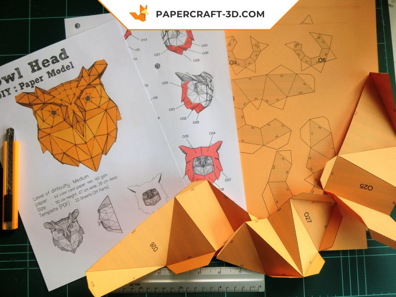 Papercraft Eulen-Kopf in 3D-Origami: digitales Kit oder komplette Box