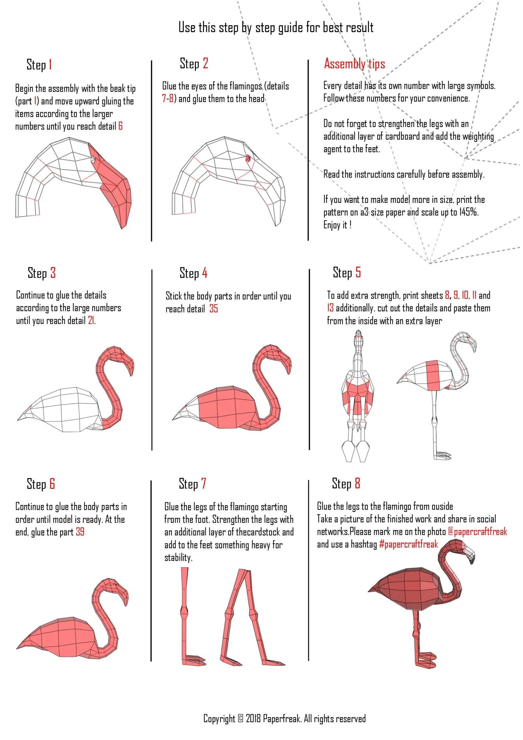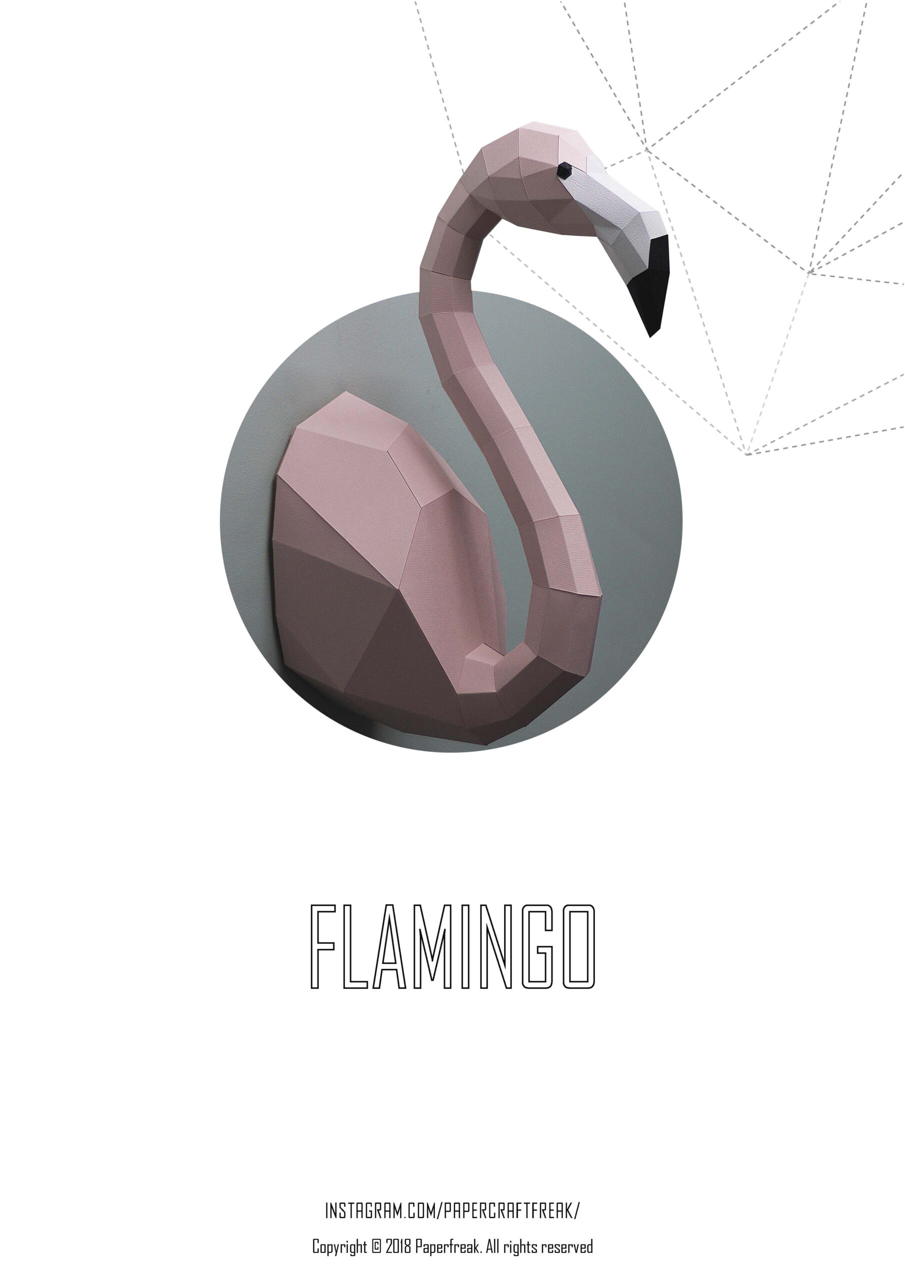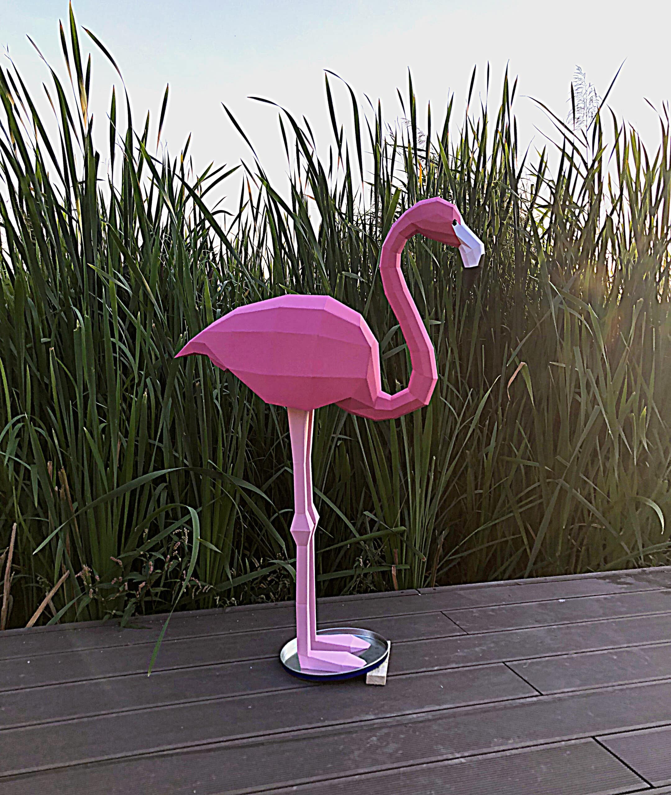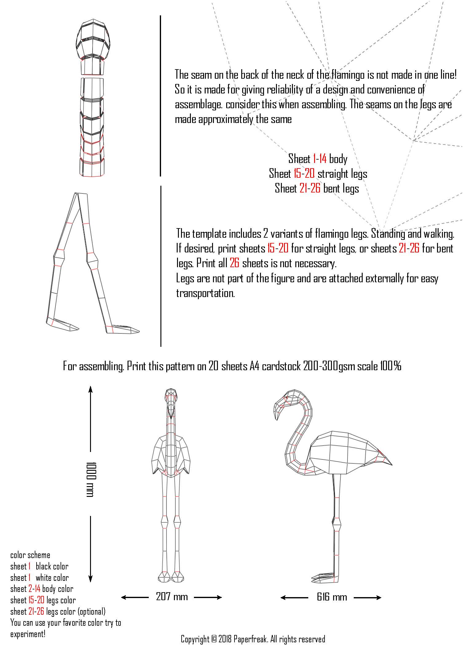 - Kompletter Flamingo: Höhe: bis zu 1000mm. Vorlage zum Drucken auf 20 A4-Blättern. Zwei Varianten der Beine: gerade oder gebogen.