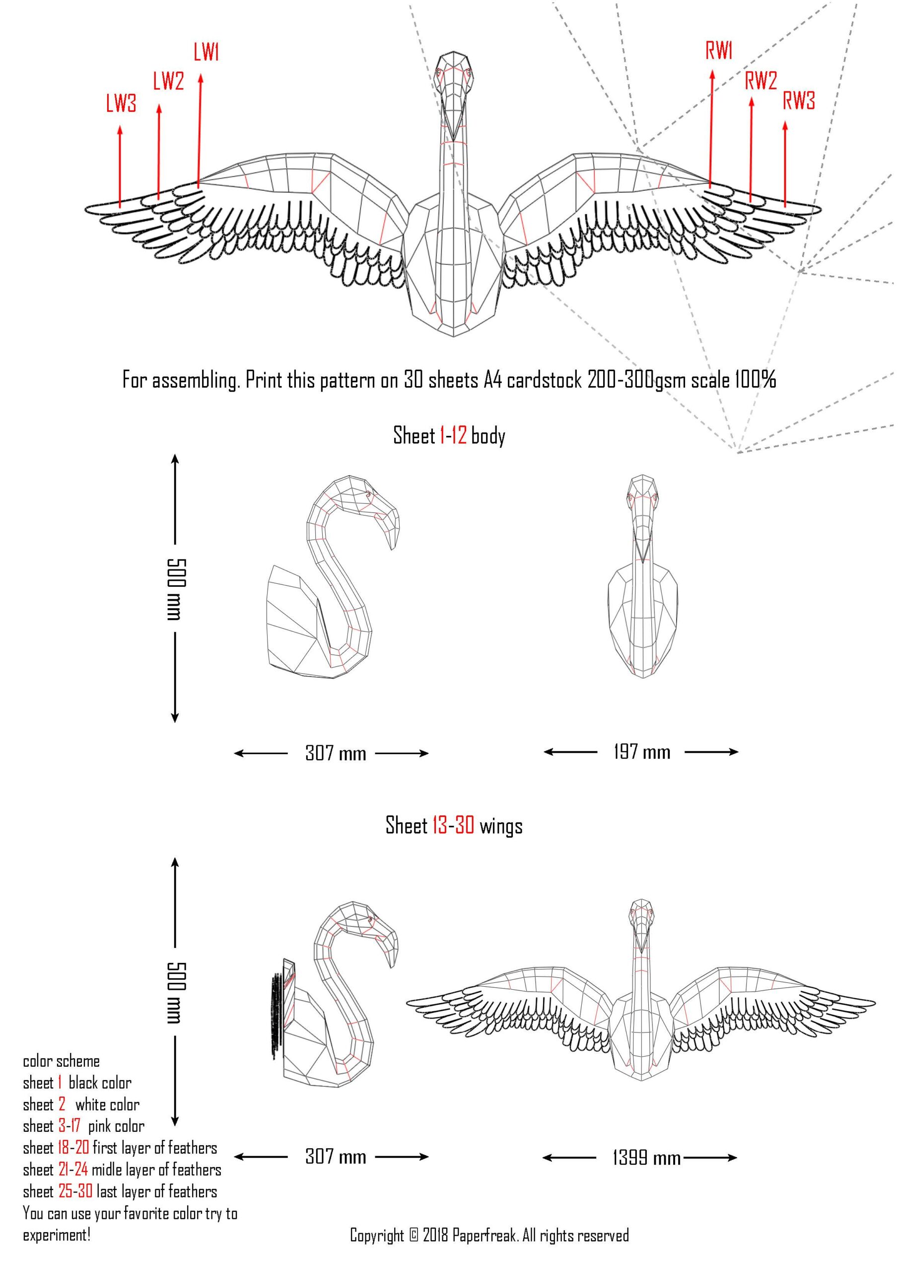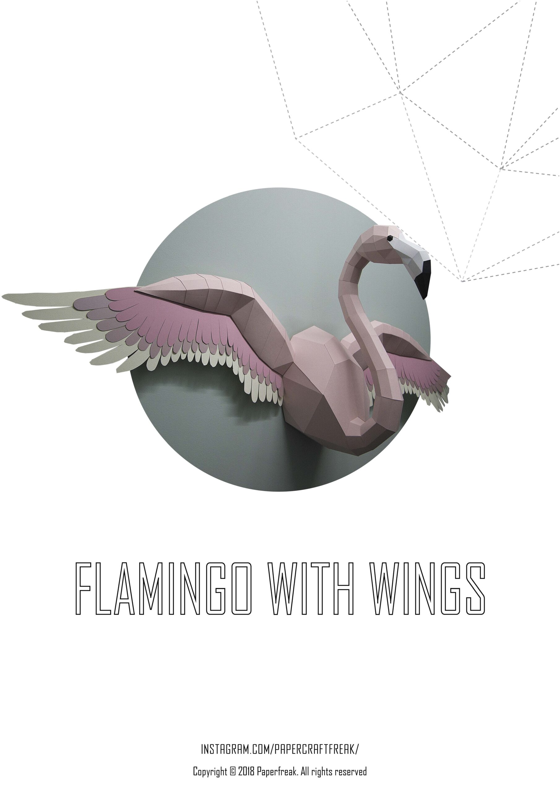 - Flamingo mit Flügeln: Höhe: ca. 500mm, Breite: 1399mm, Tiefe: 616mm. Vorlage zum Drucken auf 30 A4-Blättern.