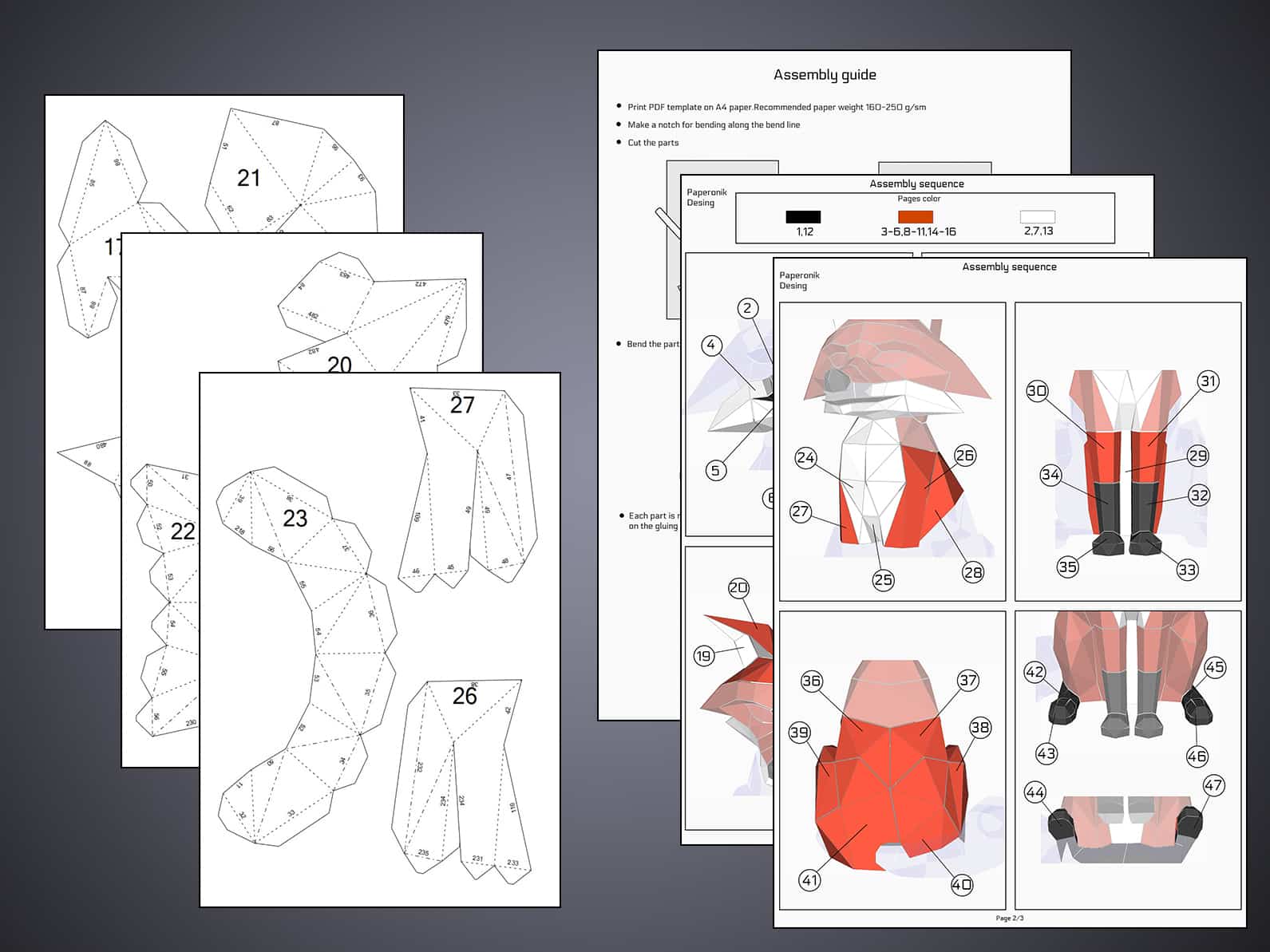 Technische Eigenschaften des Papercraft sitzender Fuchs in 3D Origami