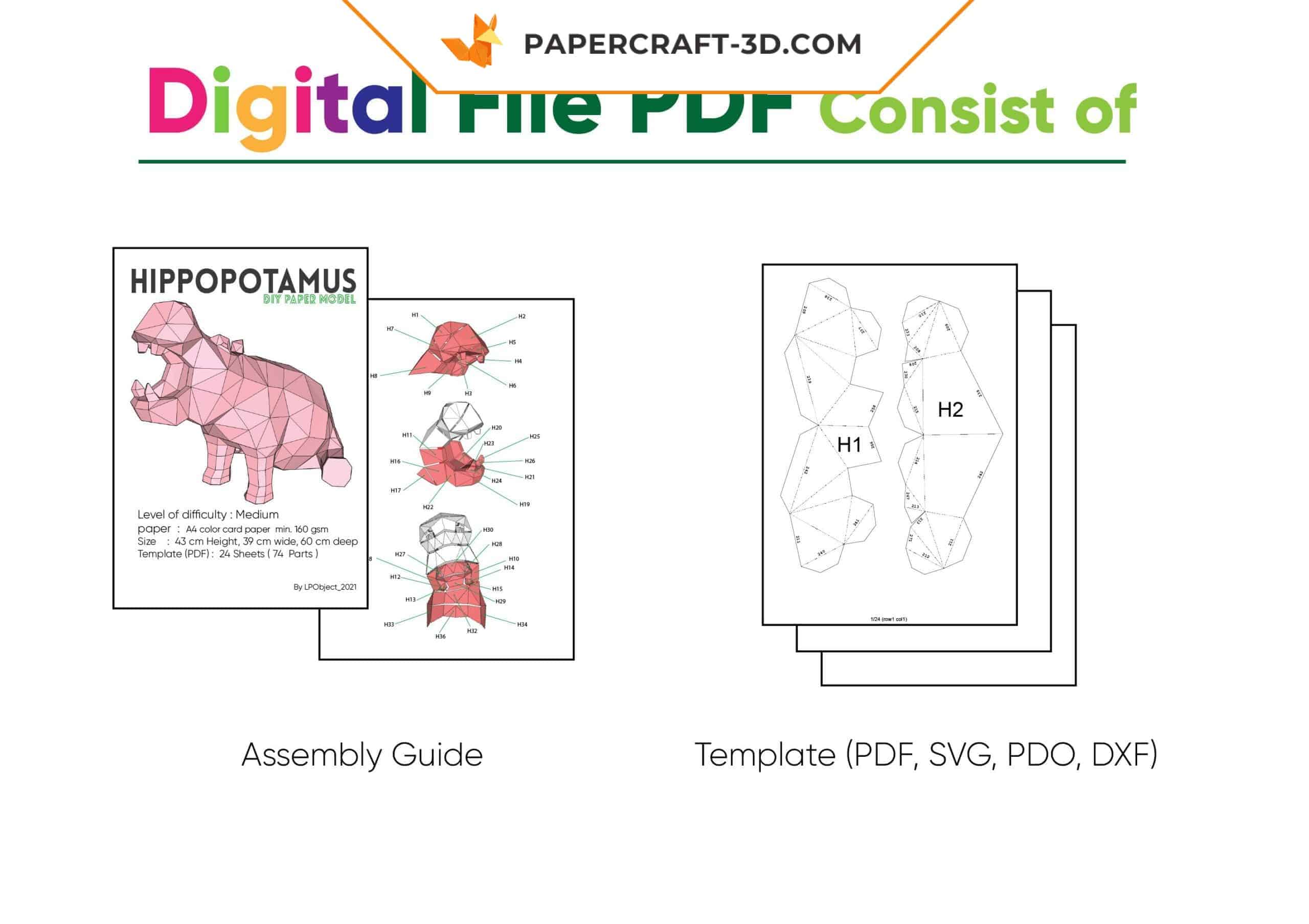 Zwei Formate für das Papercraft des sitzenden Nilpferds im 3D Origami