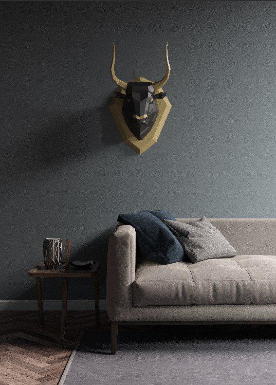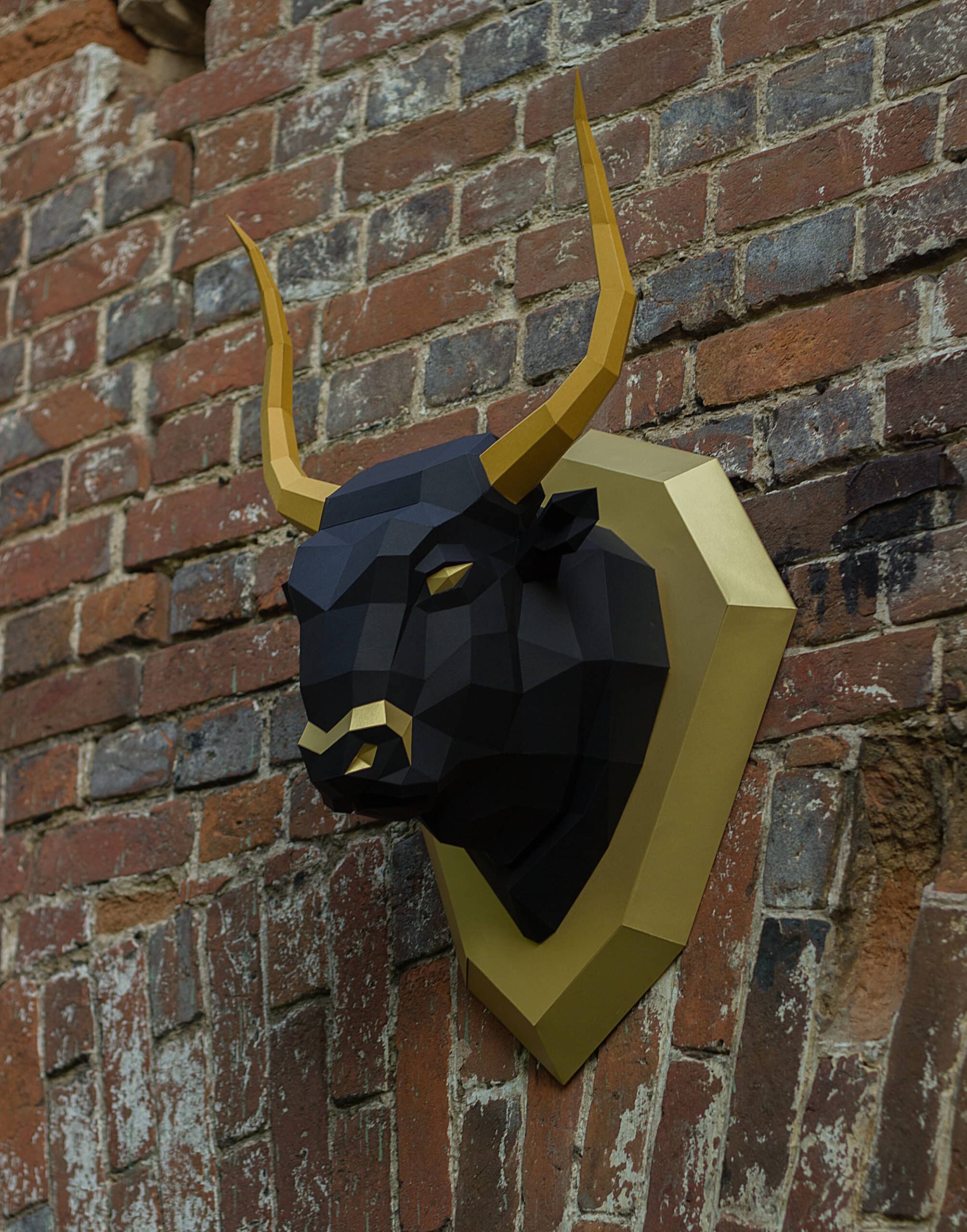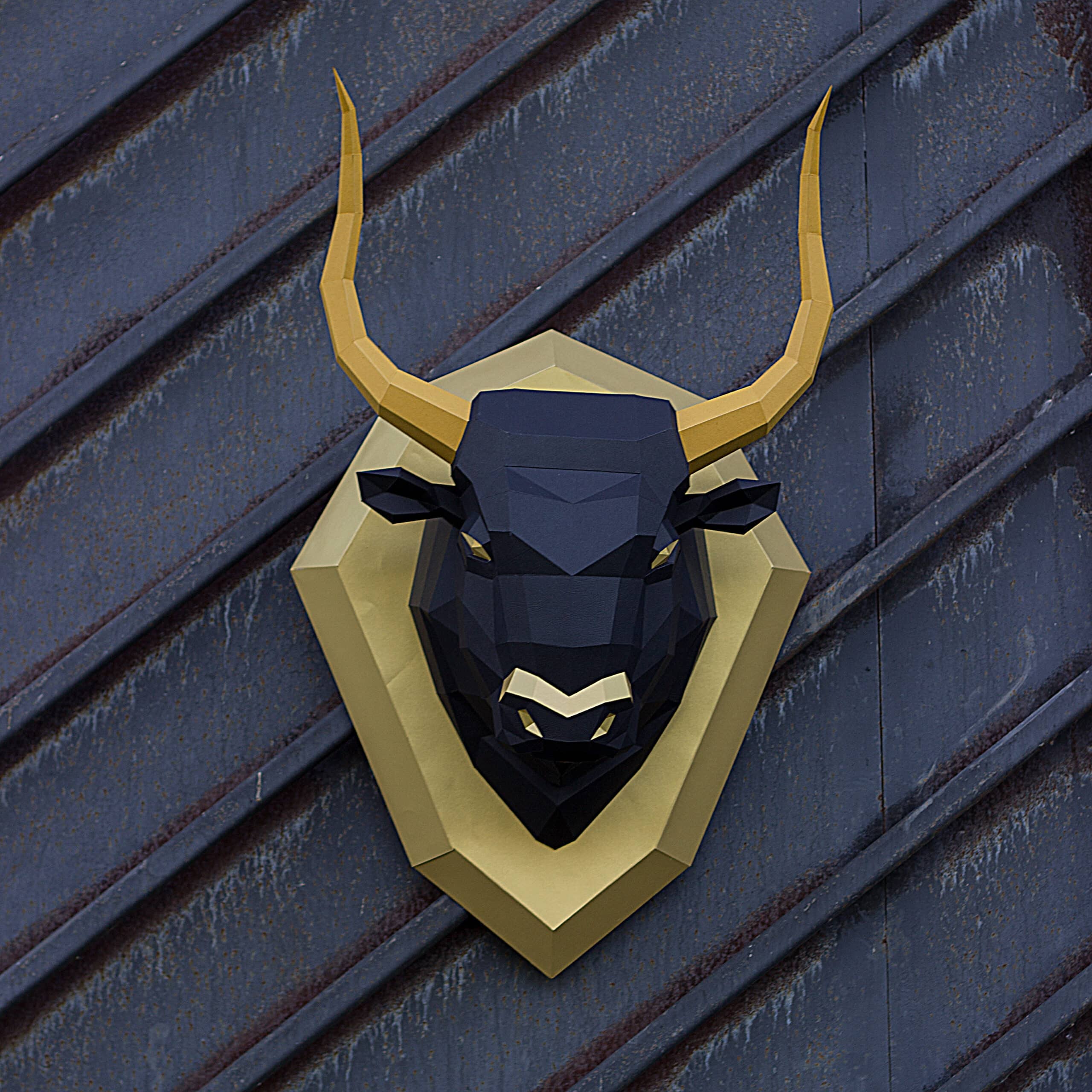 Papercraft eines Stiers auf einem Schild in 3D: digitales Kit oder komplette Box