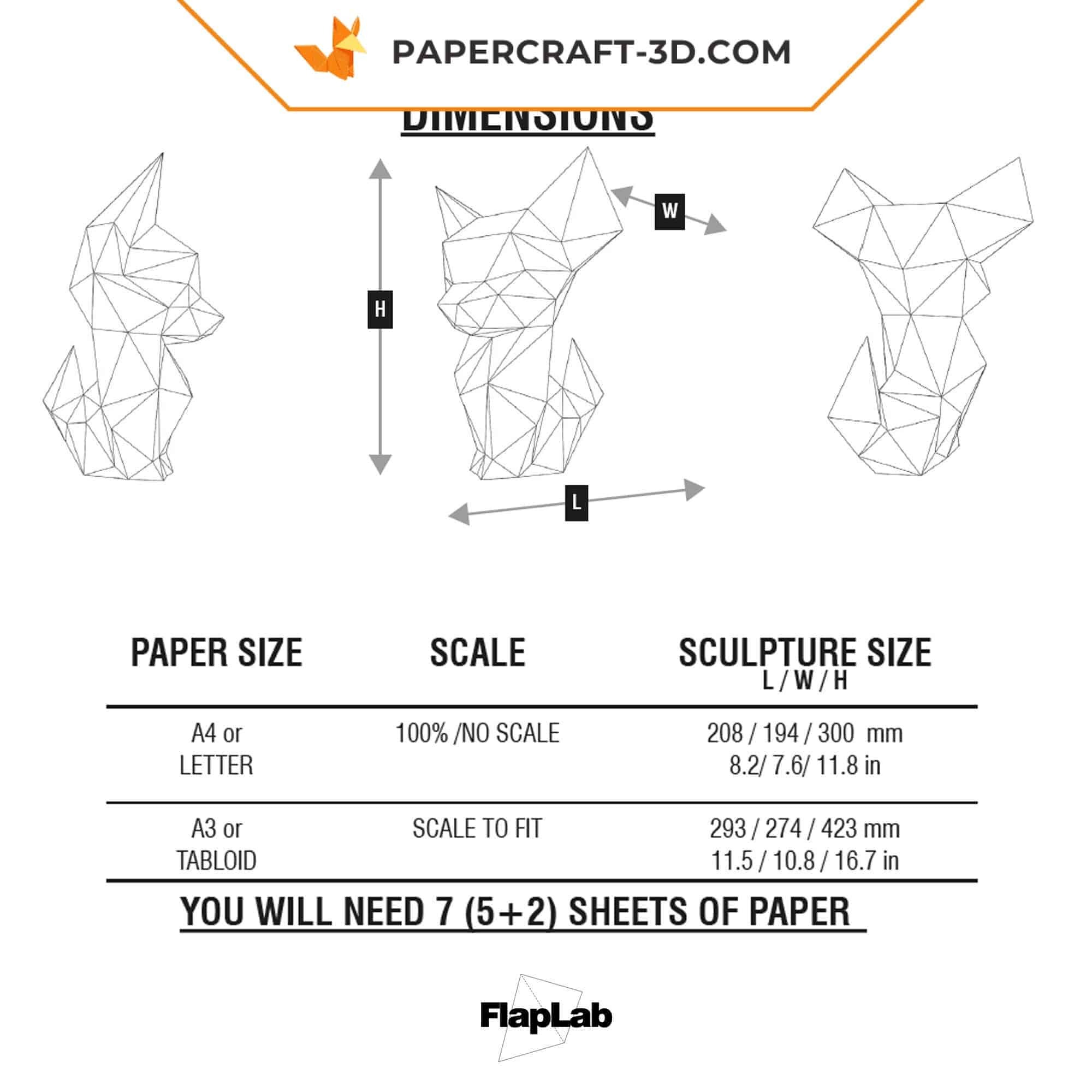 Technische Daten des Papercrafts eines süßen Fuchses in 3D-Origami