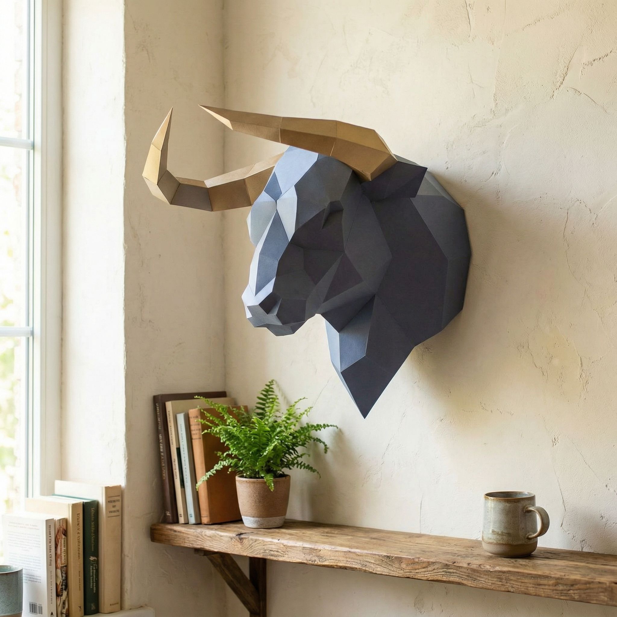 An der Wand angebracht bleibt dieser 3D-Papercraft-Stierkopf garantiert nicht unbemerkt. Er steht für rohe Kraft, Weite und einen Hauch von Wildheit, der einen Raum sofort verwandelt. Ob im modernen Wohnzimmer, im kreativen Büro oder in einem industriell gestalteten Loft – er wird zum Blickfang, fast zu einem Statement.