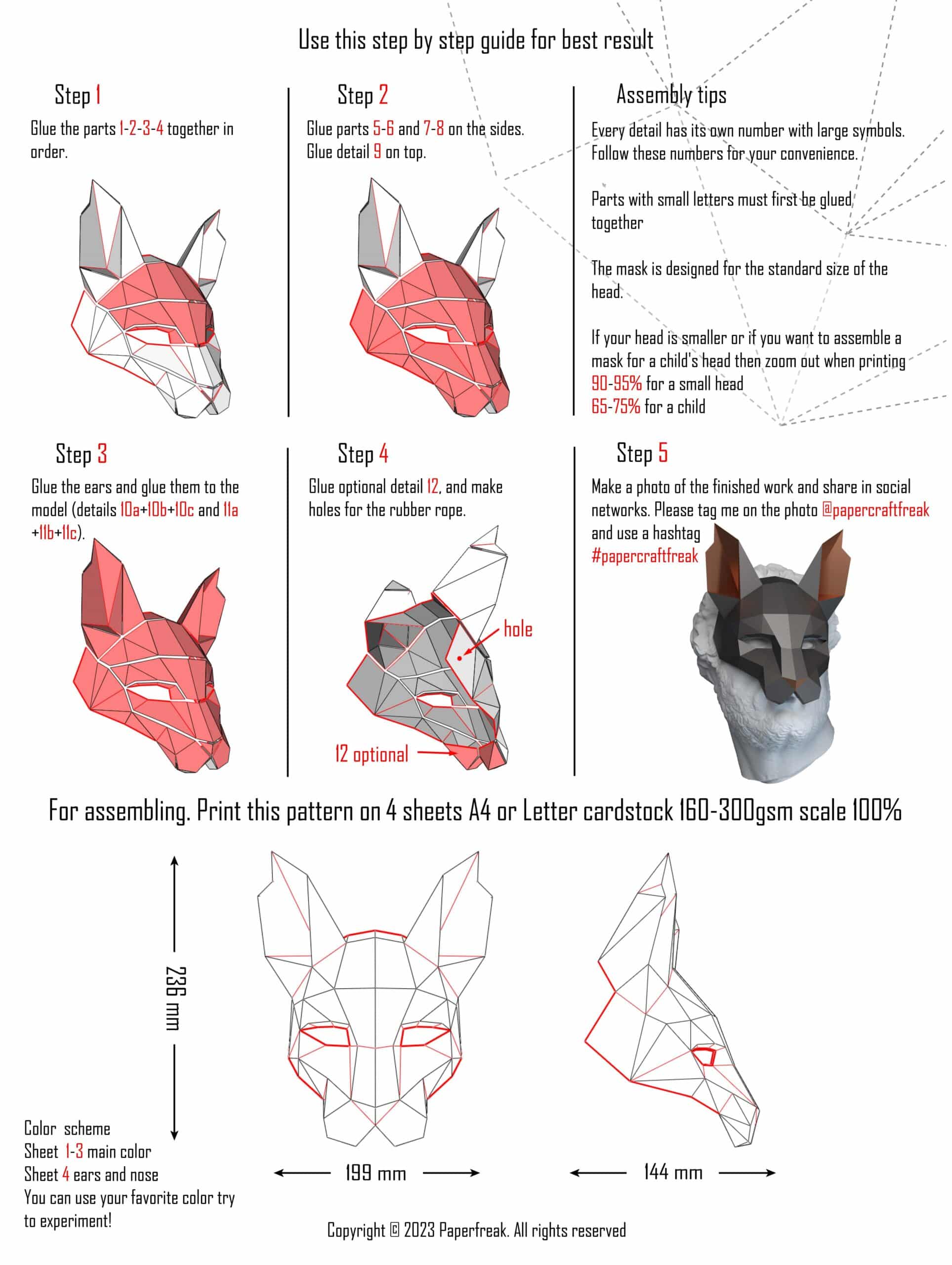 Transform yourself into a sleek and mysterious feline with the captivating 3D papercraft cat mask. Whether you’re preparing for a costume party, Halloween, or simply looking for a creative project, this geometric design is your ticket to standing out. Each fold and assembly step immerses you in the joy of crafting, culminating in a striking mask that’s as delightful to make as it is to wear. Add your personal flair with custom colors or textures, and watch as your creation comes to life.