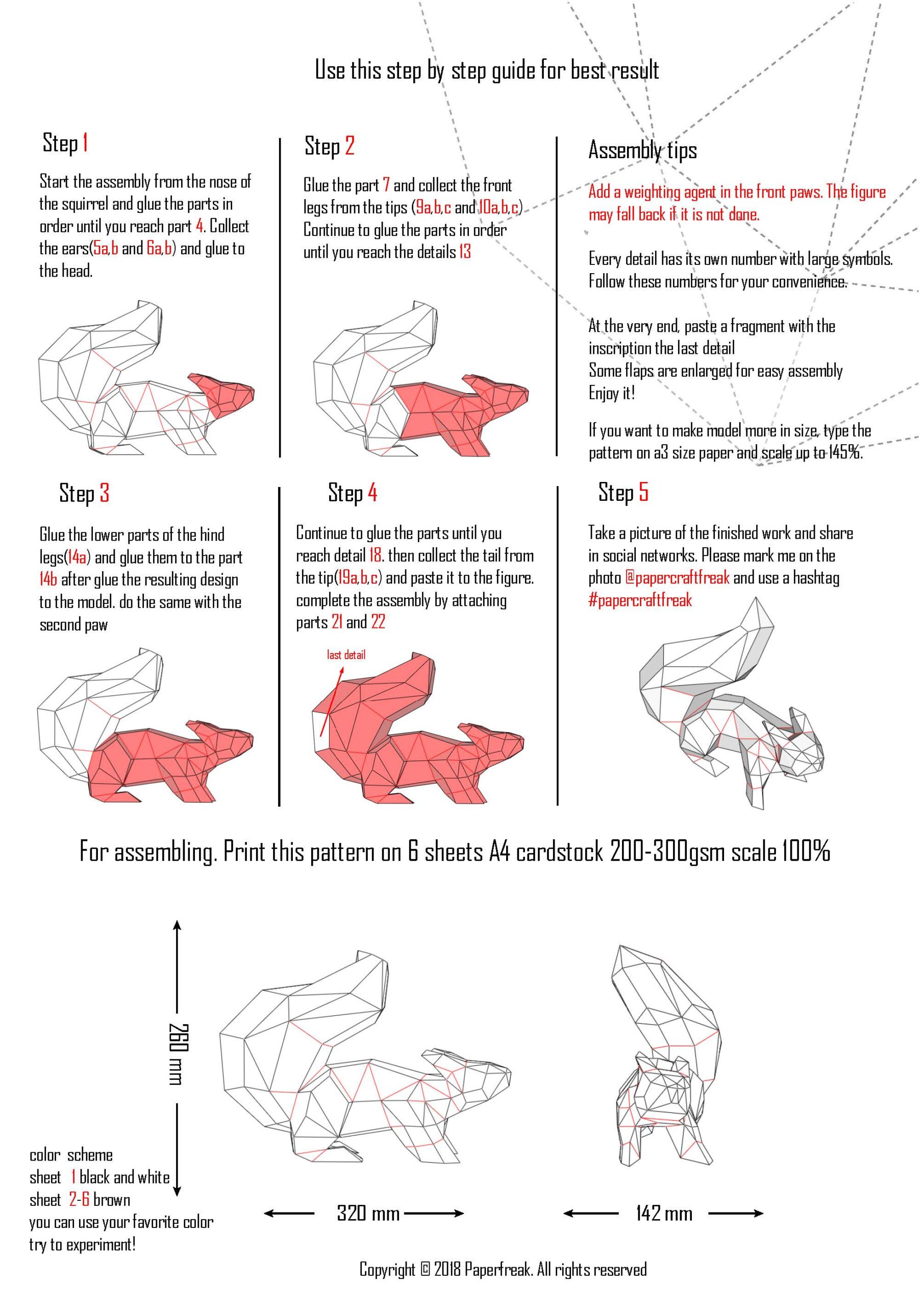 Technical details of the 3D origami papercraft squirrel
