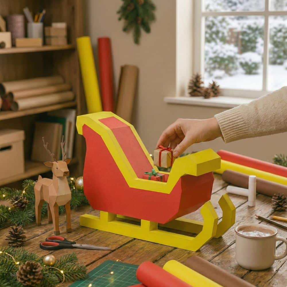 or in a Christmas window display, this sleigh naturally finds its place. It pairs beautifully with fir branches, pine cones, candles, and other papercrafts of reindeer, gifts, or characters to create a truly charming little Christmas fairytale scene in the living room.