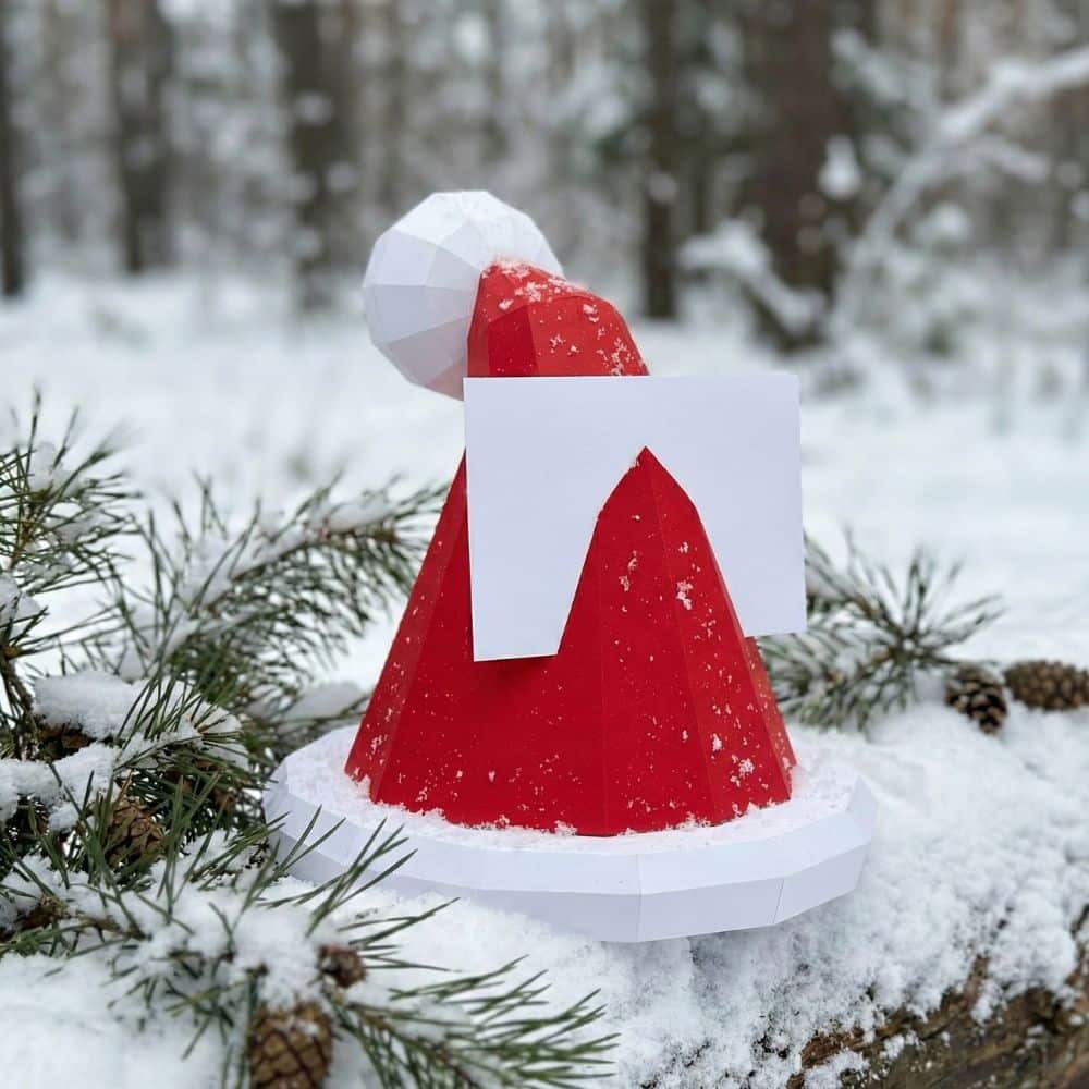 3D papercraft Santa hat that doubles as a card holder (for menus, names, messages) to decorate a piece of furniture or a festive table. This model requires 8 sheets of A4 paper, resulting in a finished hat approximately 25 × 24 × 24 cm in size. The difficulty level is easy.