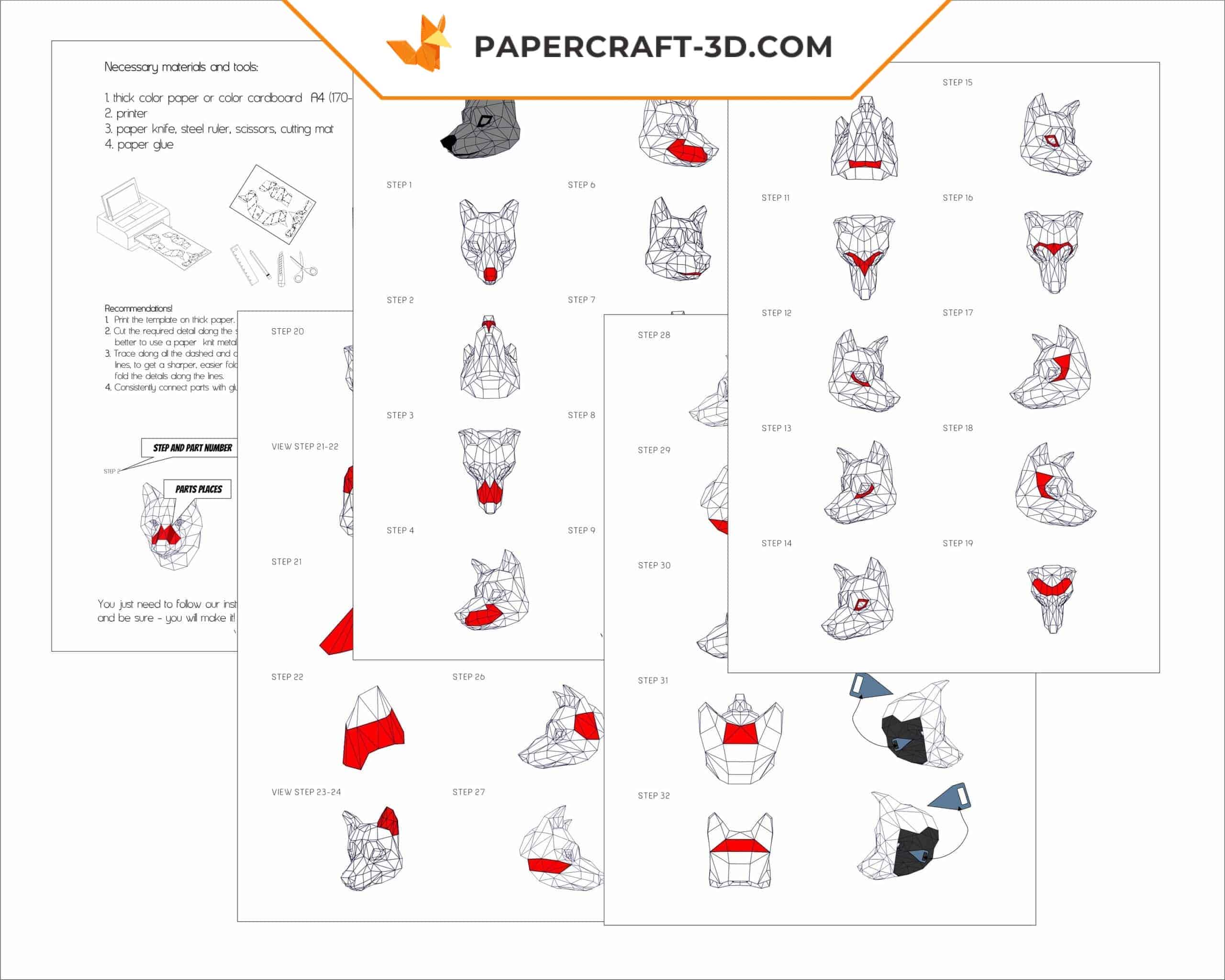 The papercraft wolf mask in 3D origami is available in two formats: a digital PDF kit for instant access and printing at home, or a physical box set that includes pre-printed sheets and all necessary accessories such as a paper knife, glue, steel ruler, and folding tool. Dive into the world of papercraft with this exceptional model.