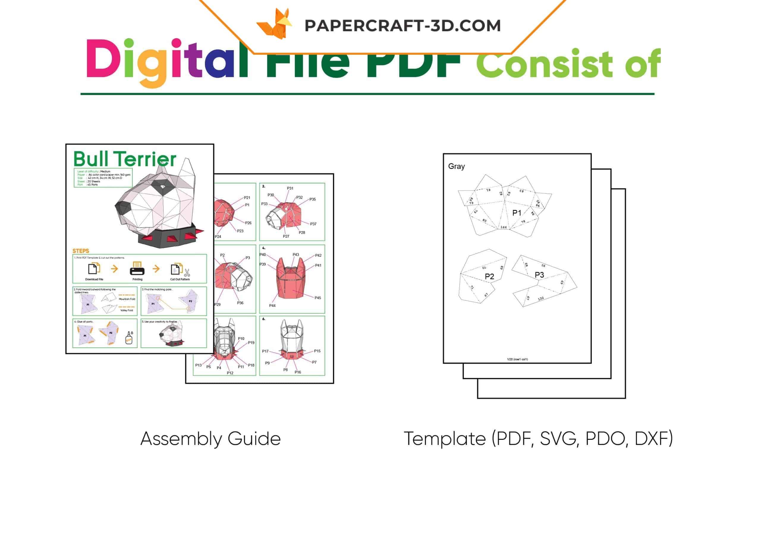 Whether you prefer the convenience of the digital kit (immediate PDF download) or the elegance of a complete box including all printed sheets and necessary accessories, our papercraft Bull Terrier mask origami is available in both formats. Choose the one that best suits your creative style and dive into the captivating world of papercraft.