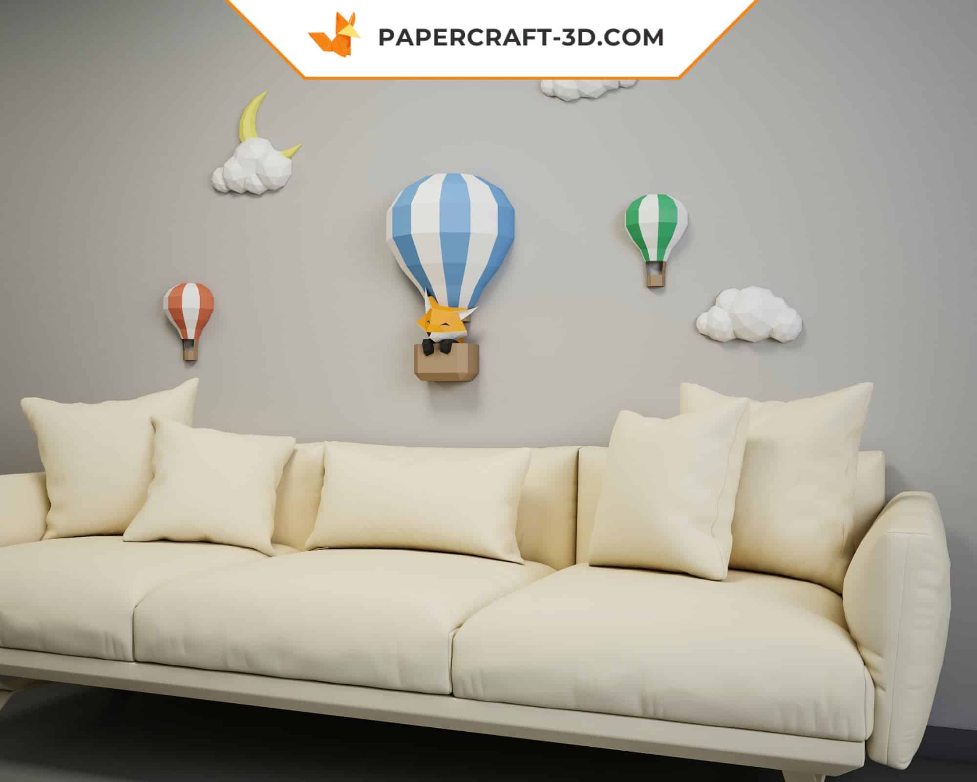 In a cozy corner of the room, picture a celestial panorama where vibrant balloons float among cute paper clouds. The Papercraft Balloons and Clouds in 3D origami transforms an ordinary space into a whimsical universe. This kit allows you to create an enchanting decor, featuring a nimble fox navigating in its balloon. Each element of this magical sky is designed to captivate and delight, offering a beautiful escape to the heavens. Explore our collection of 3D origami animals to enrich your papercraft universe.