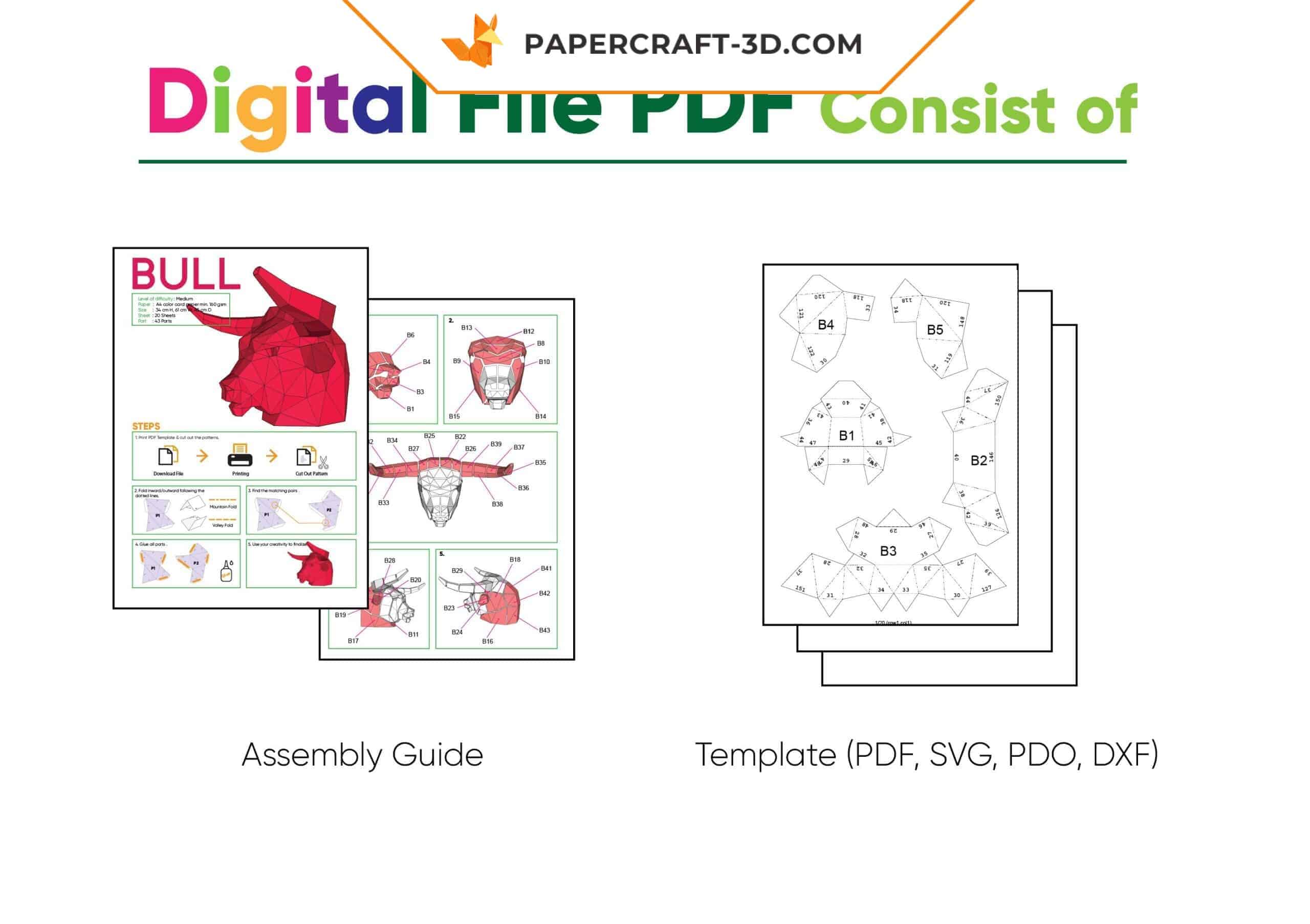 The papercraft bull mask in origami is available in two formats to suit your needs. Opt for the digital kit (downloadable PDF) if you prefer to print and assemble at home, or choose the complete box with all printed sheets and necessary accessories (paper knife, glue, steel ruler, and folder). Whether you prefer, this DIY (Do It Yourself) project is accessible to everyone, even beginners in papercraft.