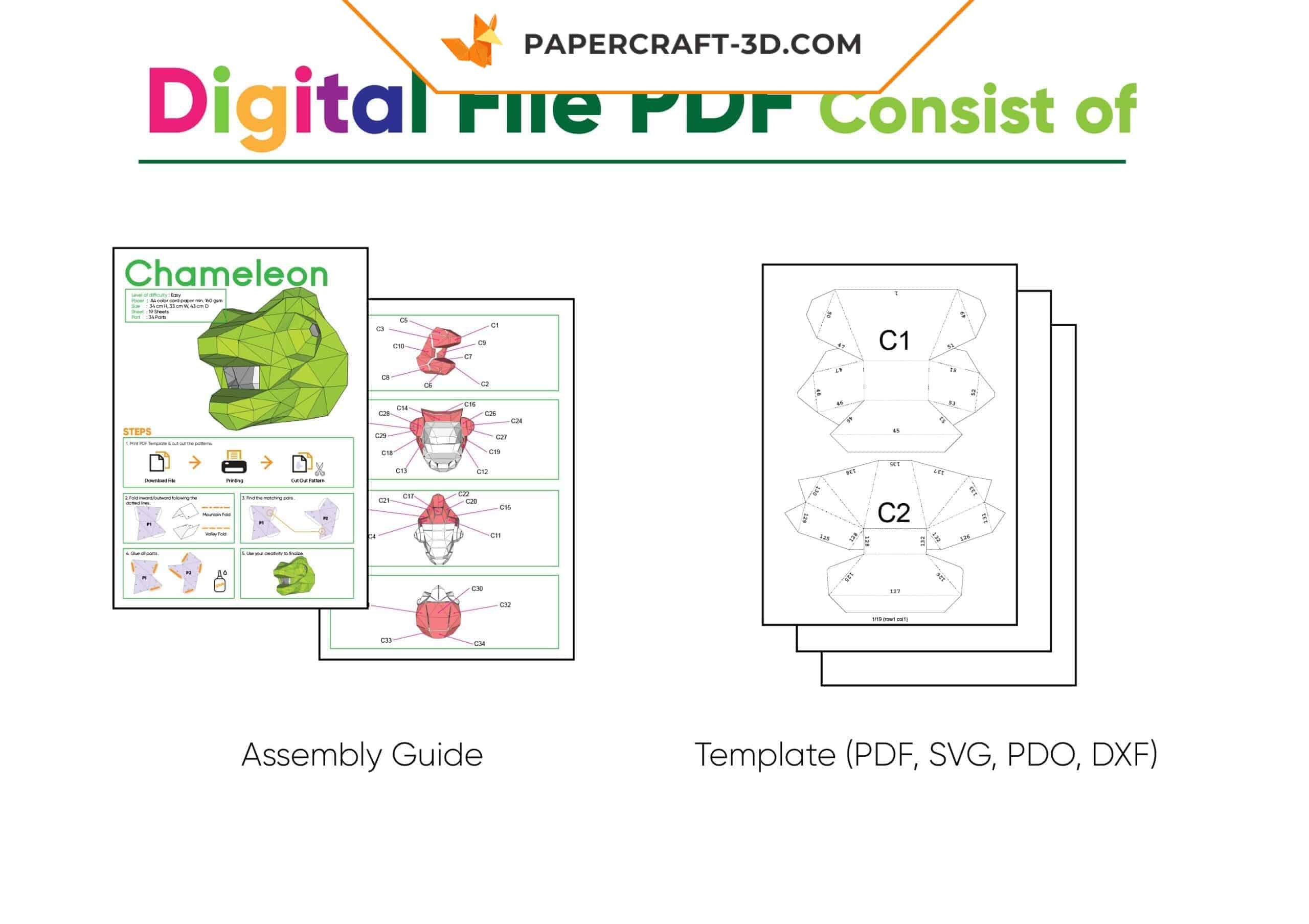 Whether you prefer a digital kit to download or a complete box with all necessary accessories, our 3D origami chameleon mask papercraft is available in both formats. Choose the option that suits you best and embark on this creative adventure.