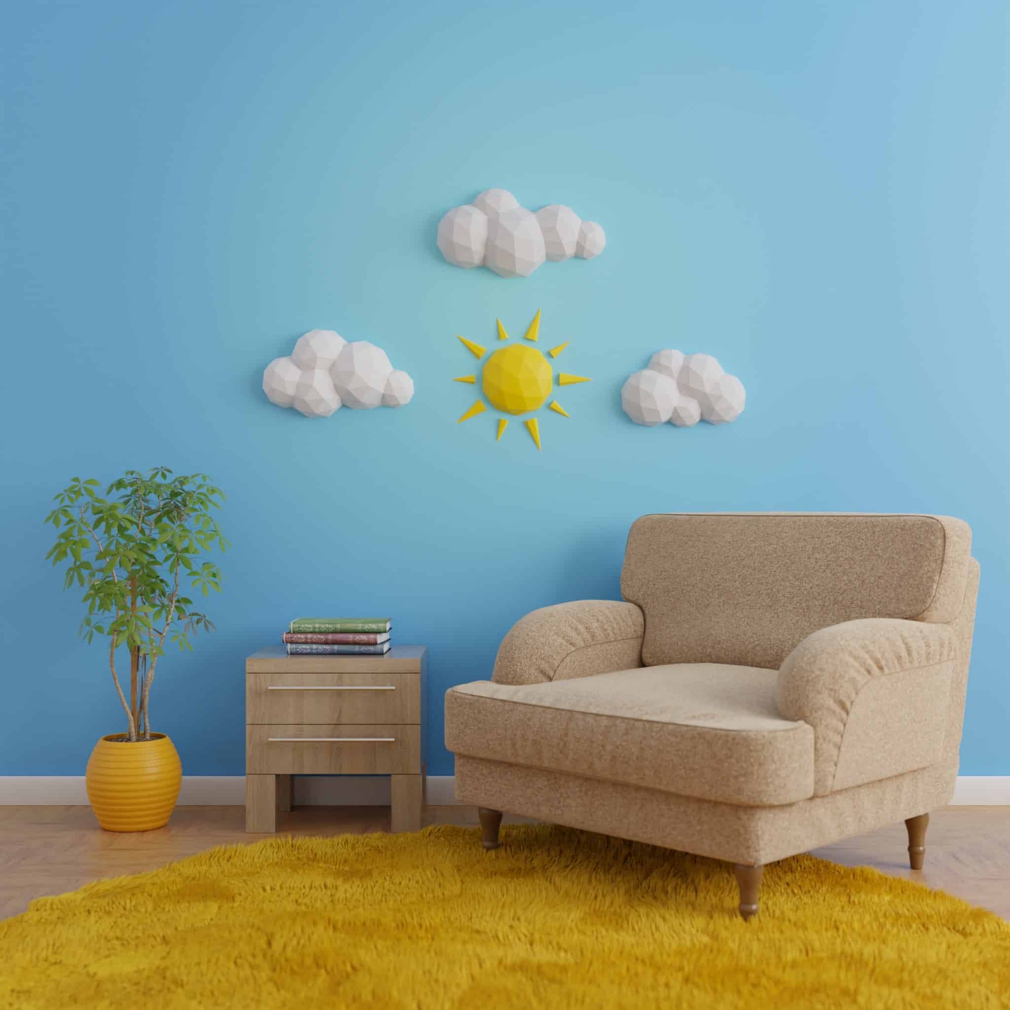 In a realm where the sky is always blue and the sun shines eternally, this clouds and sun origami papercraft kit invites you to create your own wall paradise. Picture a child’s room transformed into a haven of peace and joy with these four 3D paper models: a radiant sun and three fluffy clouds. Perfect for both young and old, this kit not only beautifies bedrooms but also living rooms, offices, or nurseries, bringing a touch of softness and serenity. Explore our 3D wall origami collection for more enchanting creations.