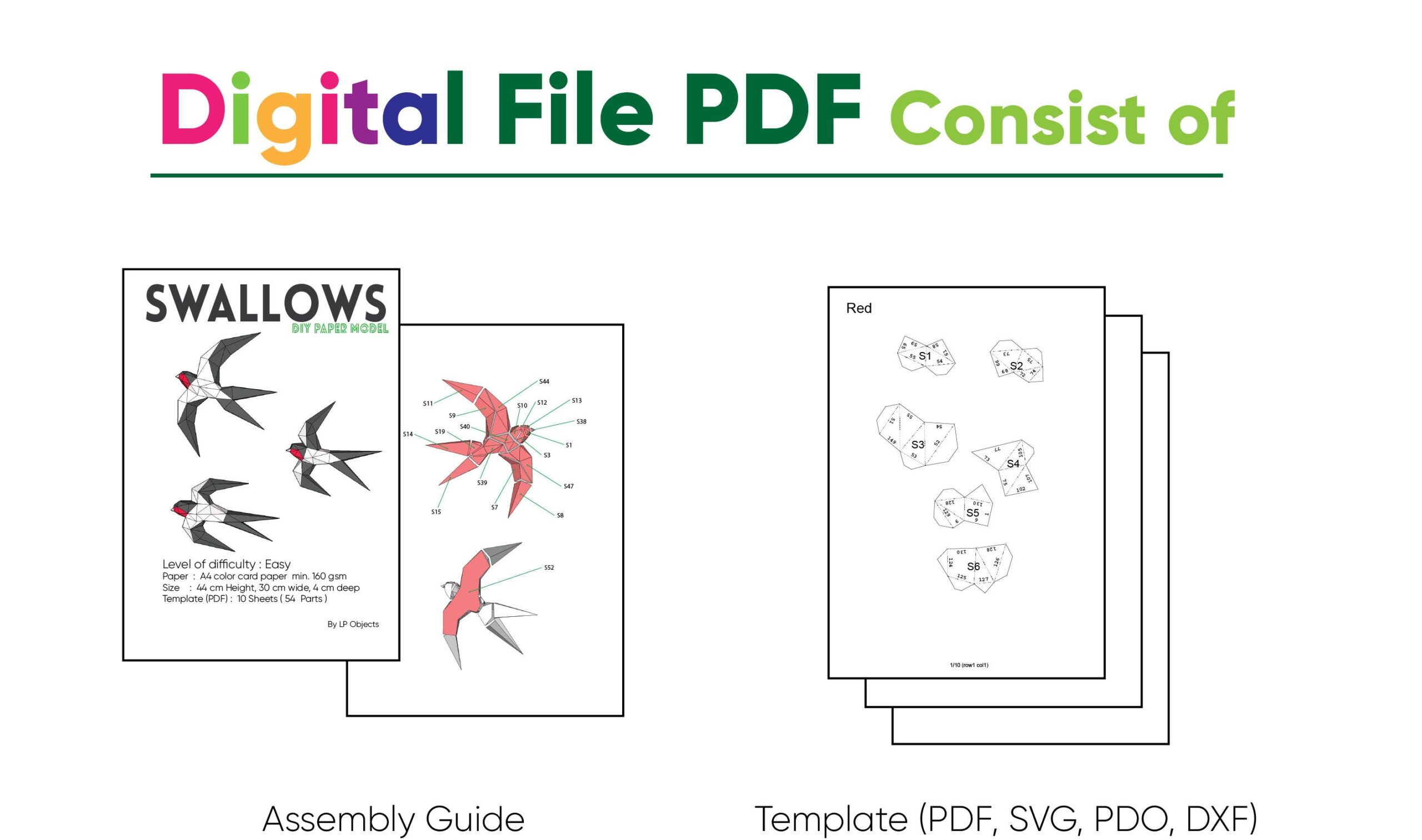 Choose between the instantly downloadable digital papercraft kit or the complete box with everything you need to assemble your paper swallows. Whether you’re a DIY enthusiast or prefer to receive a beautiful ready-to-use box, we have what you need to accomplish this creative project.
