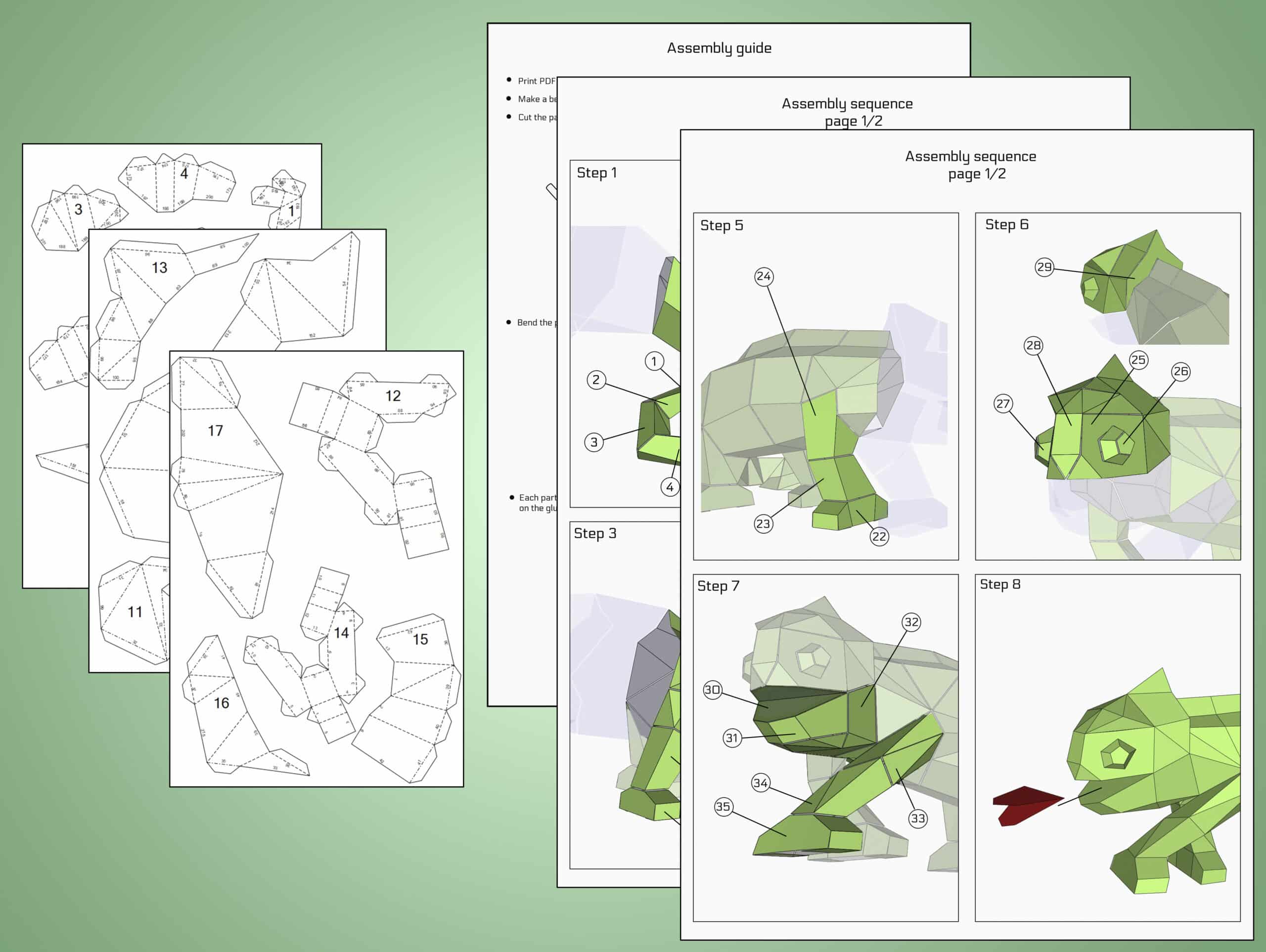 Number of sheets: 8Size: Height: 16 cm, Width: 34 cm, Depth: 18 cmDownloadable files: Chameleon Assembly Guide.pdf, Chameleon Template.pdf, Chameleon_svg.zip