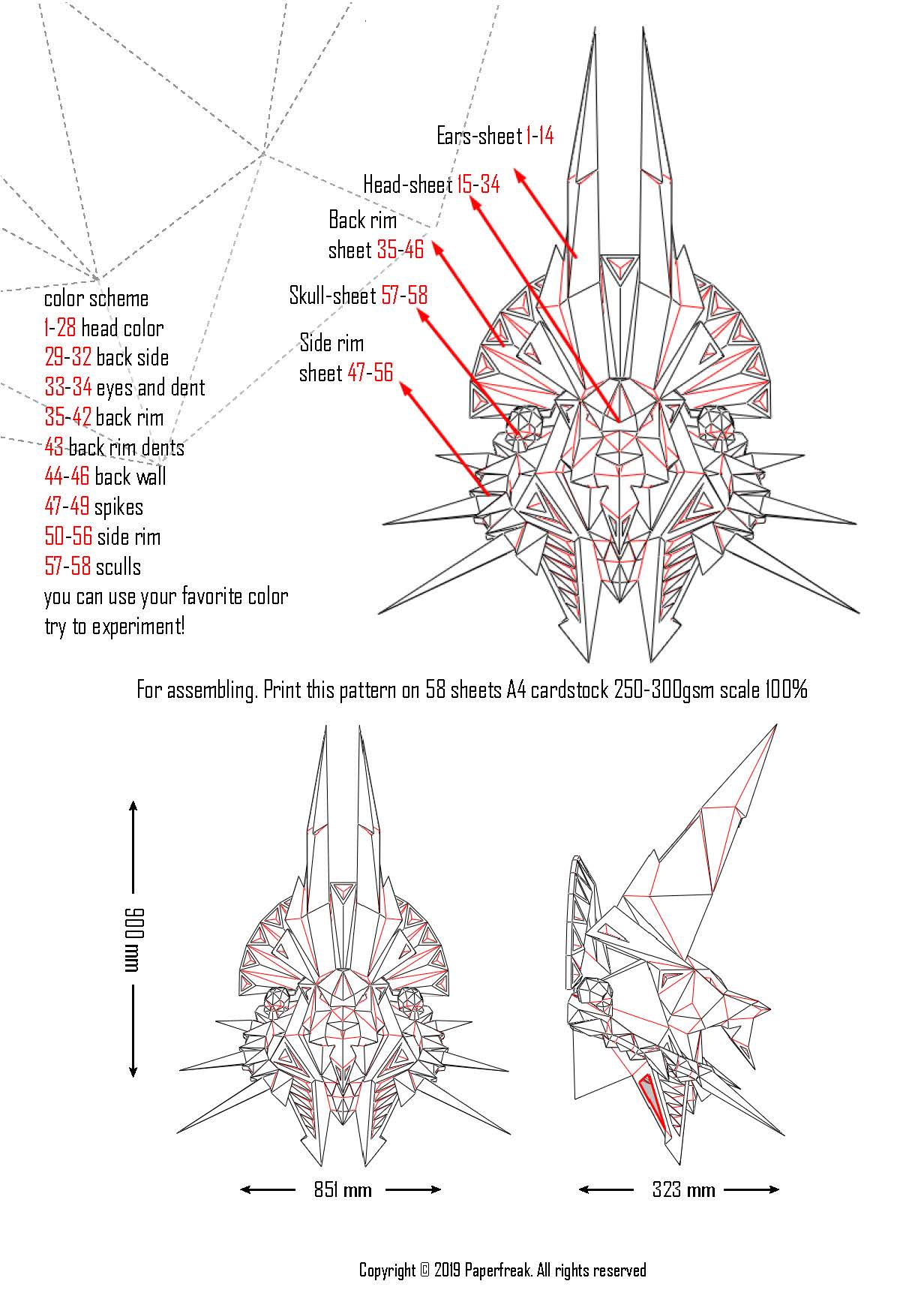 This papercraft model consists of 58 A4 sheets to be printed on 250-300gsm cardstock. Once assembled, it measures 900mm in height, 323mm in depth, and 851mm in width. Each assembly step is carefully explained to ensure an impressive final result.