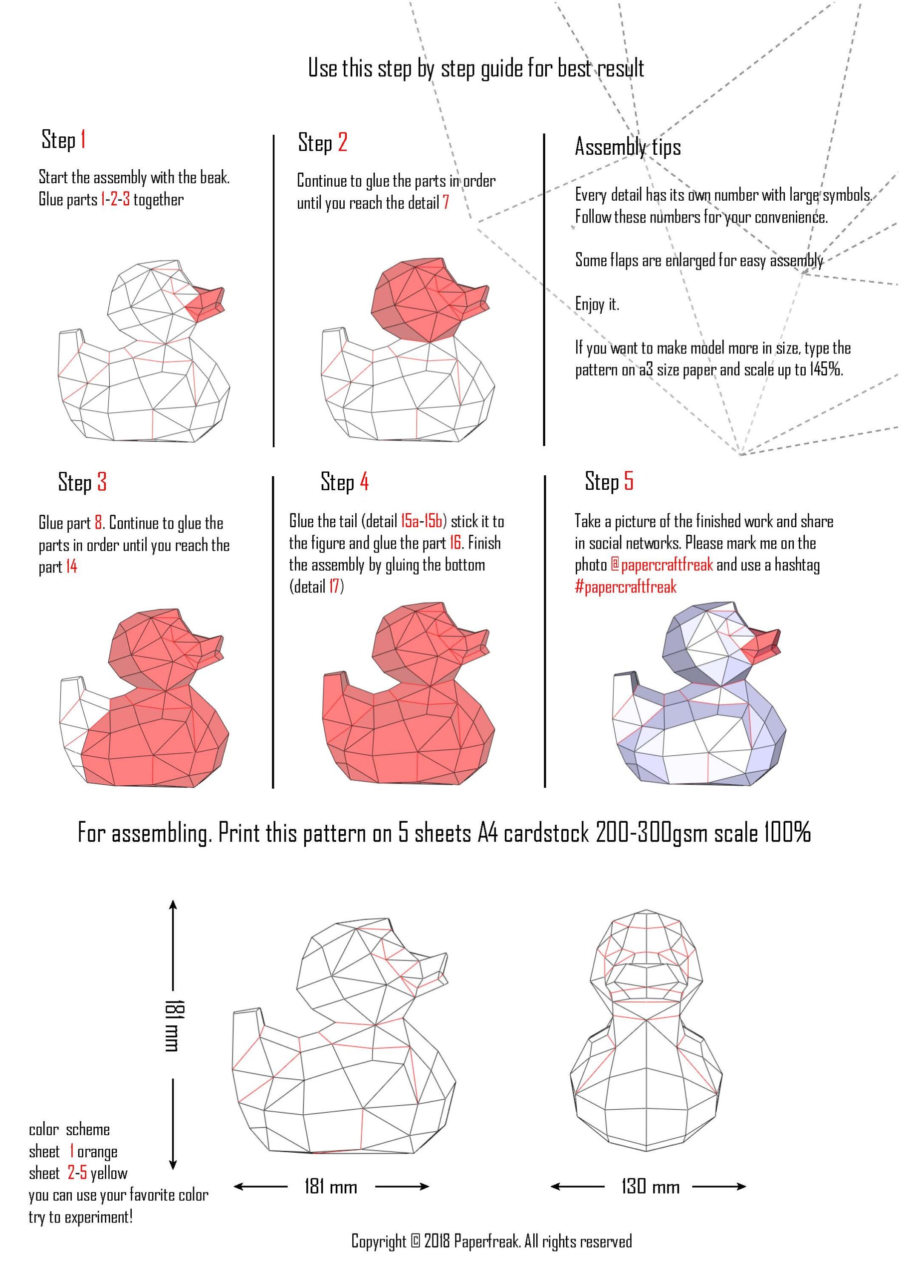On a gentle sunny morning, a little duck embarks on an exciting adventure. This 3D papercraft duck, to be assembled by yourself, invites you to live this playful story and add a unique touch to your home decor. With dimensions of 181mm in height and depth, and 130mm in width, this colorful model will transform your space into a haven of creativity. To discover other equally captivating models, explore our complete collection of 3D origami animals.