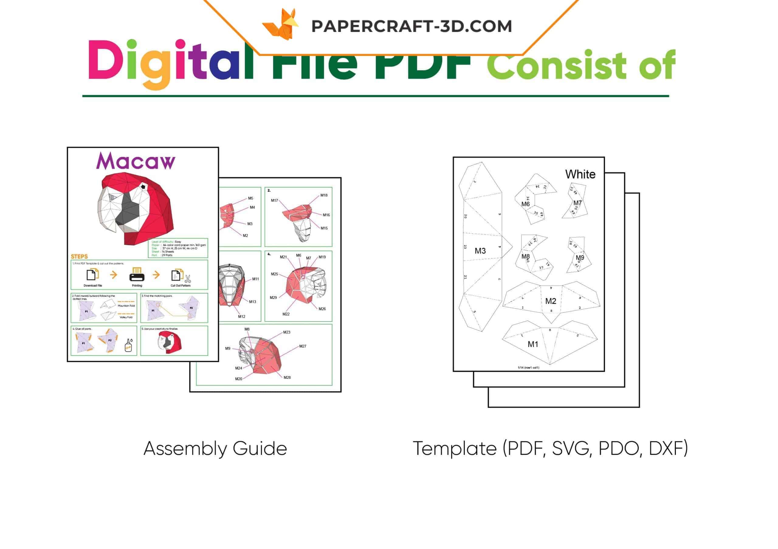 The large format model of the 3D origami parrot mask papercraft measures 550 x 500 x 360 millimeters (21.6 x 19.6 x 14.1 inches). Print it on letter-sized cardstock, recommended between 200 and 300 gsm for better durability and stability. The clear instructions PDF is spread over 8 sheets, while the detailed model consists of 23 sheets (66 parts), including color suggestions to personalize your creation.
