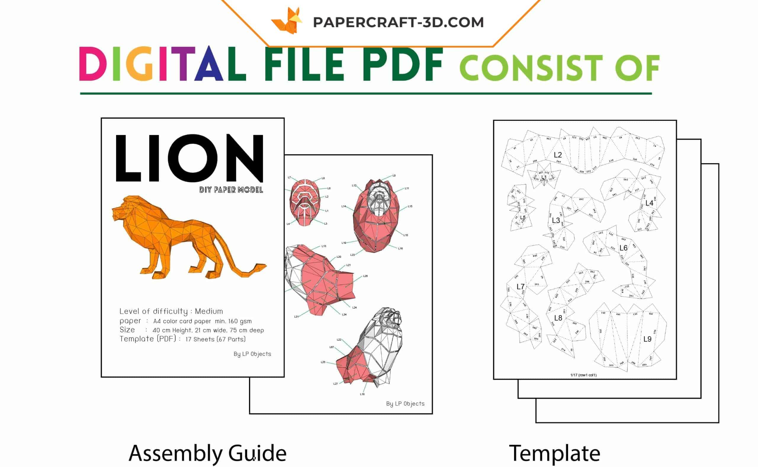 Our 3D origami lion papercraft is available in two formats: the digital PDF kit for immediate download, and the complete box containing all the printed sheets and necessary accessories (paper knife, glue, steel ruler, and folder). Choose the format that suits you best to embark on this creative adventure.