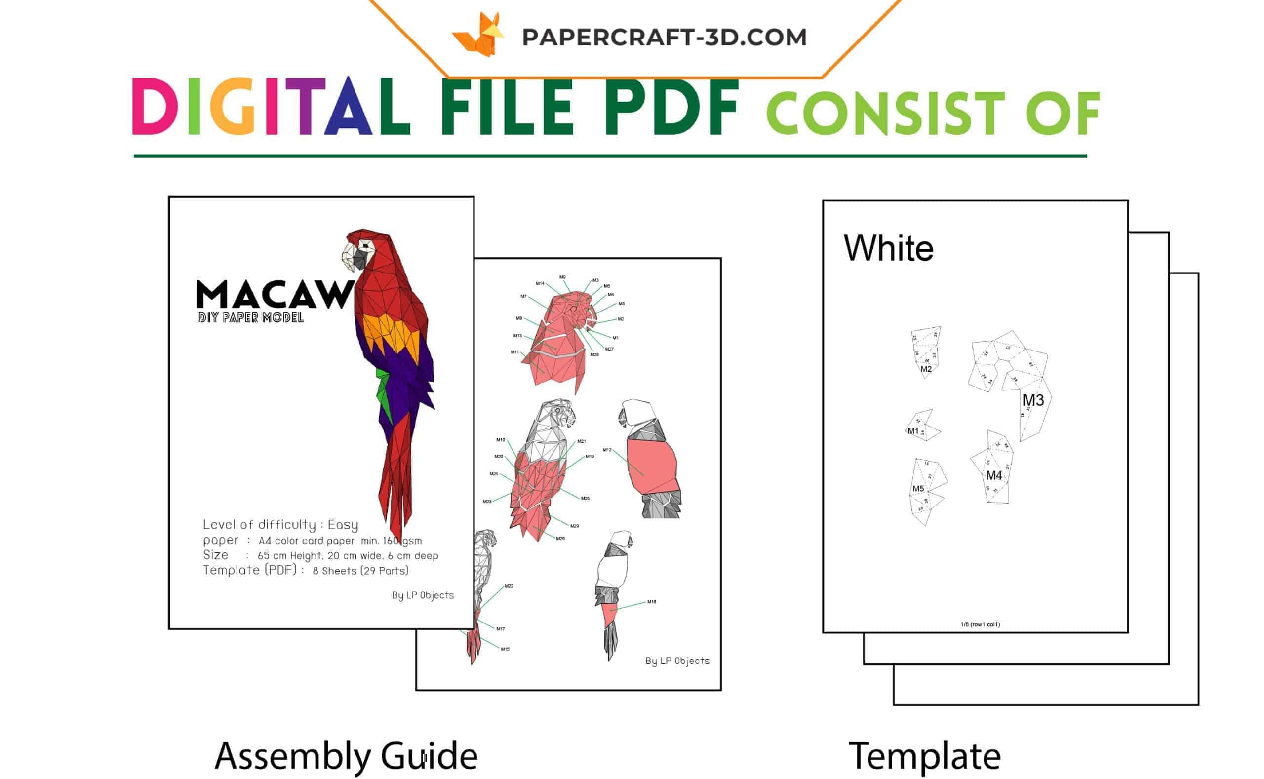 Whether you choose the downloadable digital kit or the complete box with all necessary accessories, our 3D origami wall macaw papercraft will meet your expectations. The PDF template includes clear and precise instructions to cut, fold, and assemble the 29 pieces spread across 8 sheets of A4 cardstock. In just 2 to 3 hours, you can admire your creation!