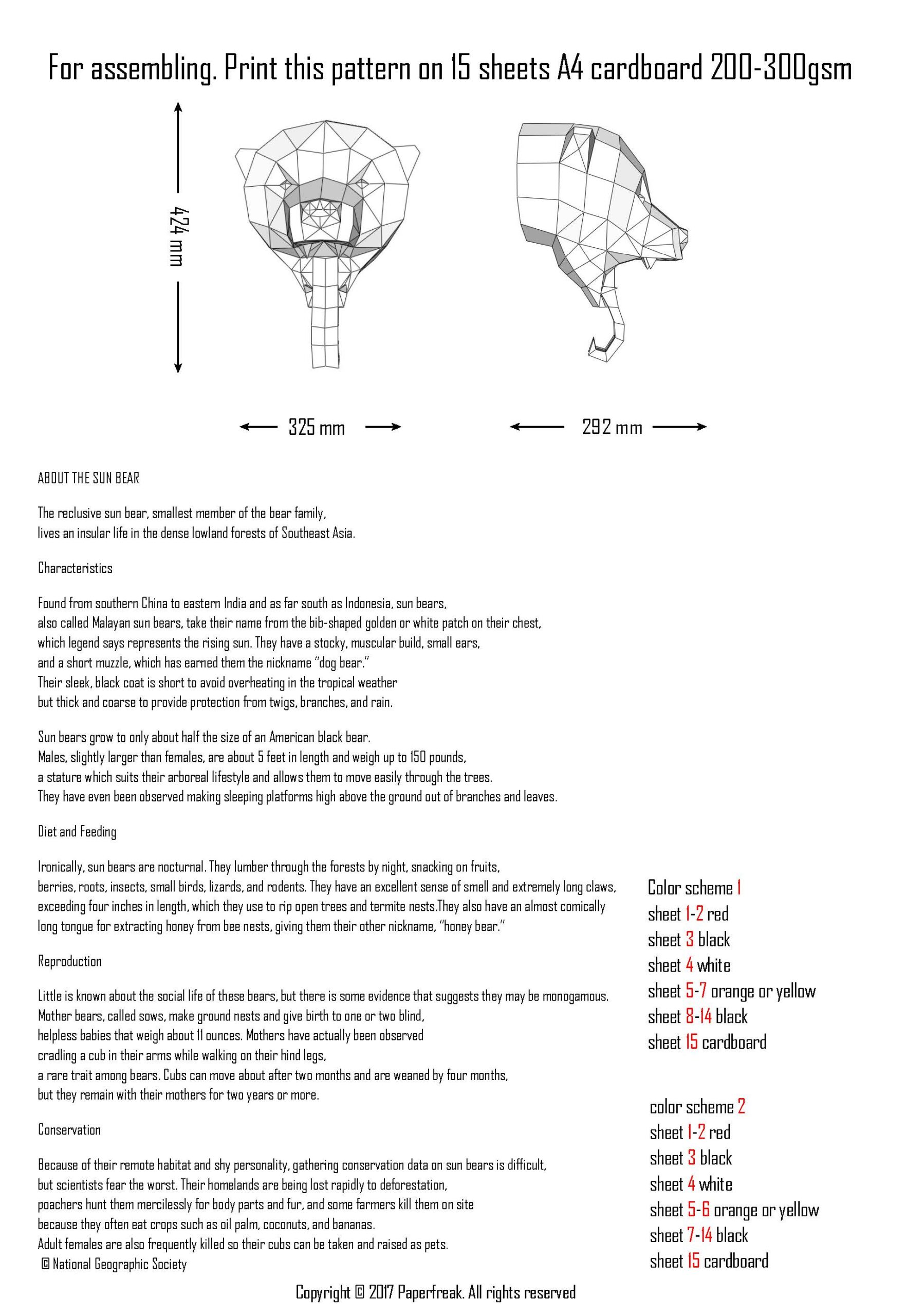 Características técnicas del papercraft cabeza de oso malayo en origami