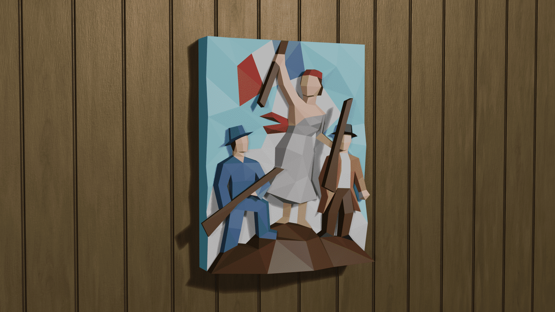 Una bandera en alto, una multitud en movimiento, el impulso crudo de la libertad. Este cuadro mural en papercraft 3D reinterpreta la obra emblemática de Delacroix con formas geométricas marcadas, casi escultóricas. El papel gana relieve, la historia sale del marco.