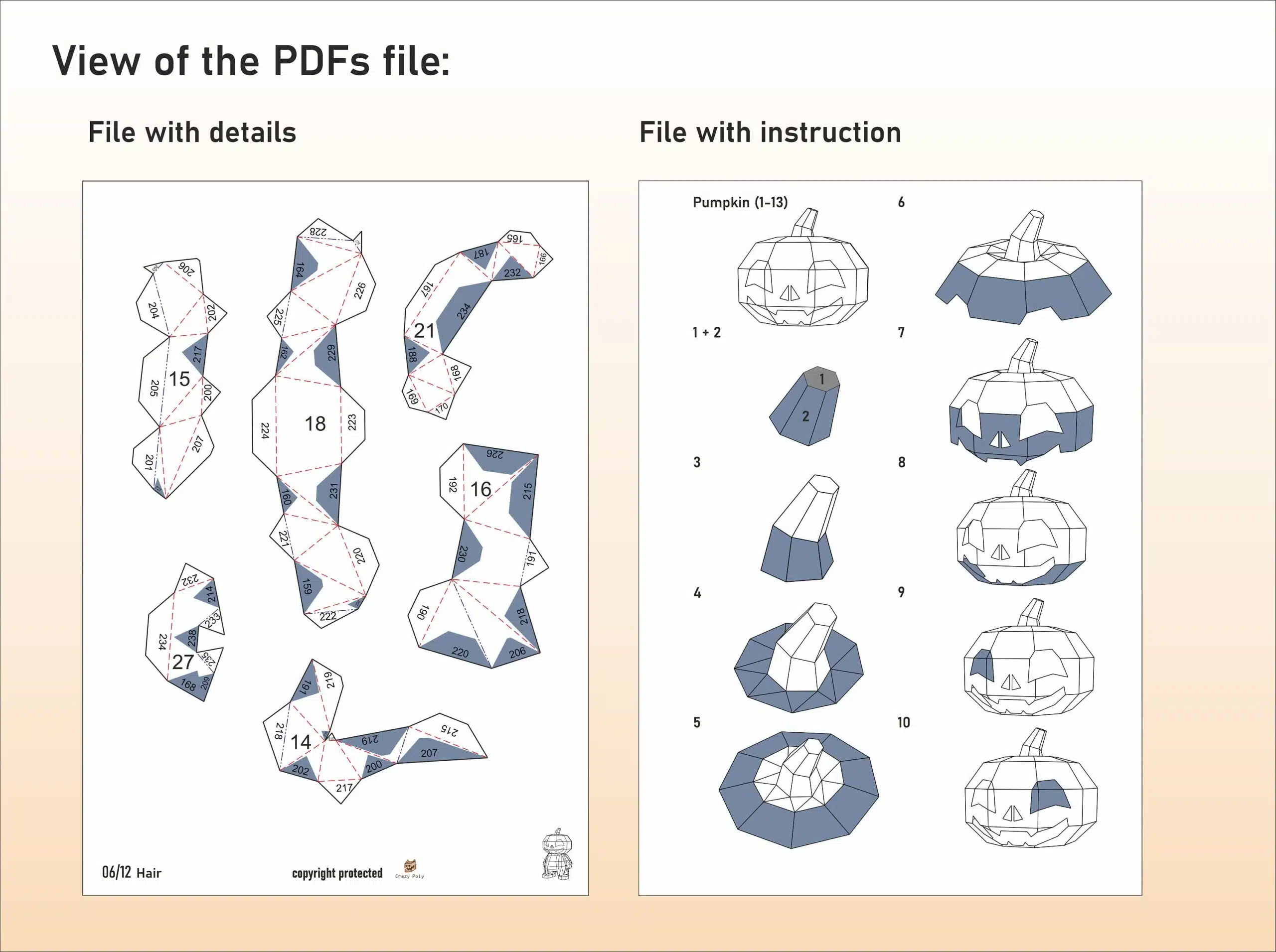 ¡No pierdas esta oportunidad única! Regálate o regala a tus seres queridos una actividad manual relajante y satisfactoria con nuestro papercraft calabaza 3D en origami. Perfecto para amantes de las manualidades, decoradores que buscan originalidad o familias deseando compartir un momento divertido con los niños. Añade esta pieza única a tu colección hoy mismo y prepárate para sorprender a tus invitados en la próxima fiesta de Halloween.