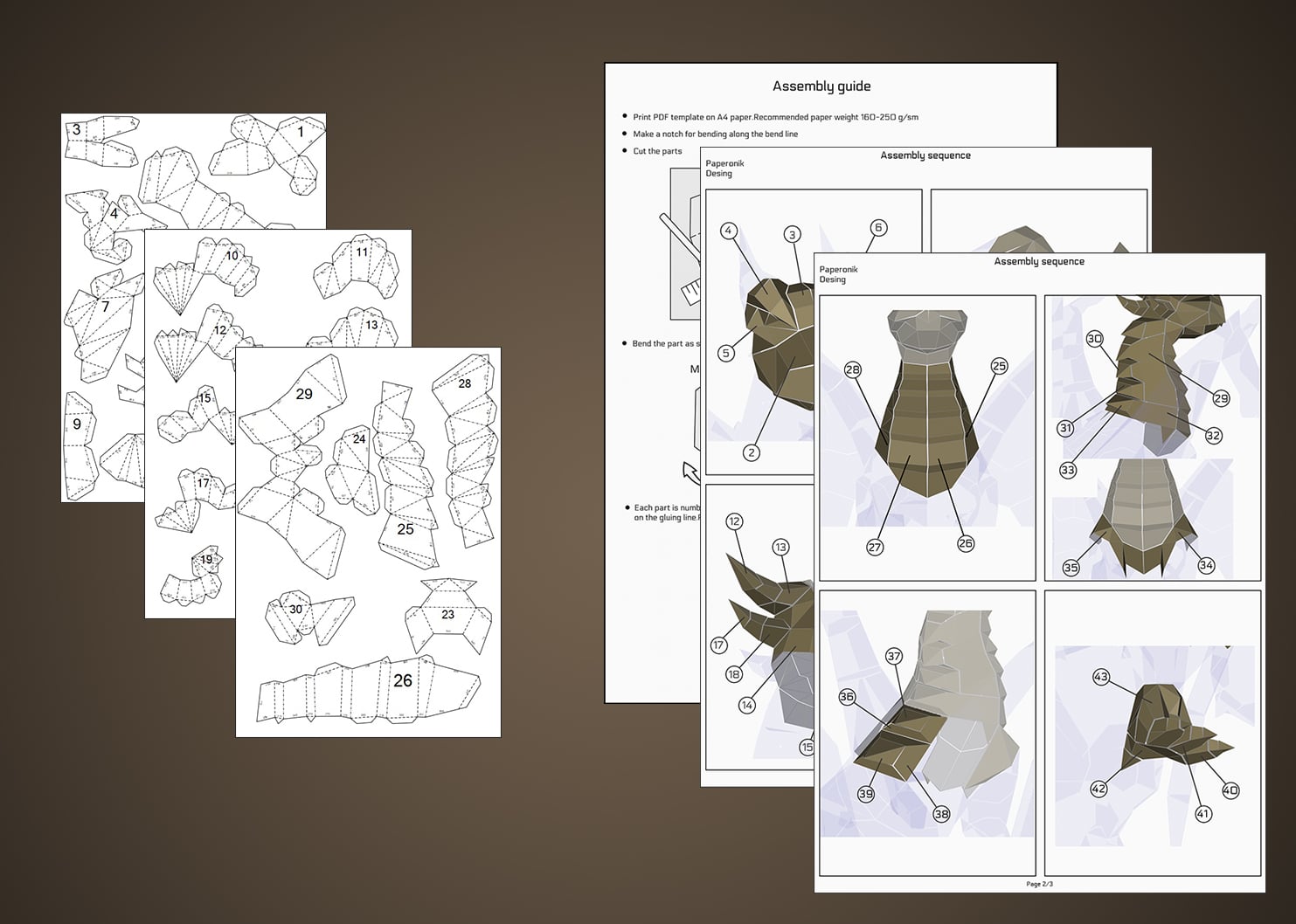 El modelo de dragón está impreso en hojas A3. Número de hojas: 23. Dimensiones si se imprime en A3: