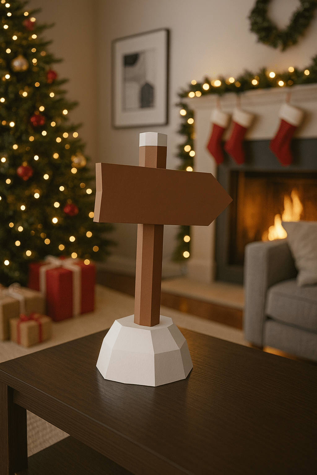Una noche de diciembre, el salón se transforma: luces centelleantes, una manta sobre el sofá, velas listas para encender. En el centro de la escena, este pequeño y estilizado letrero de madera parece señalar el camino hacia las fiestas. A medida que se ensamblan sus facetas, collage tras collage, adquiere la atmósfera de un decorado navideño: la base blanca evoca nieve compacta, el poste se yergue como un tronco de árbol esculpido y la flecha casi invita a seguir la dirección de los regalos.