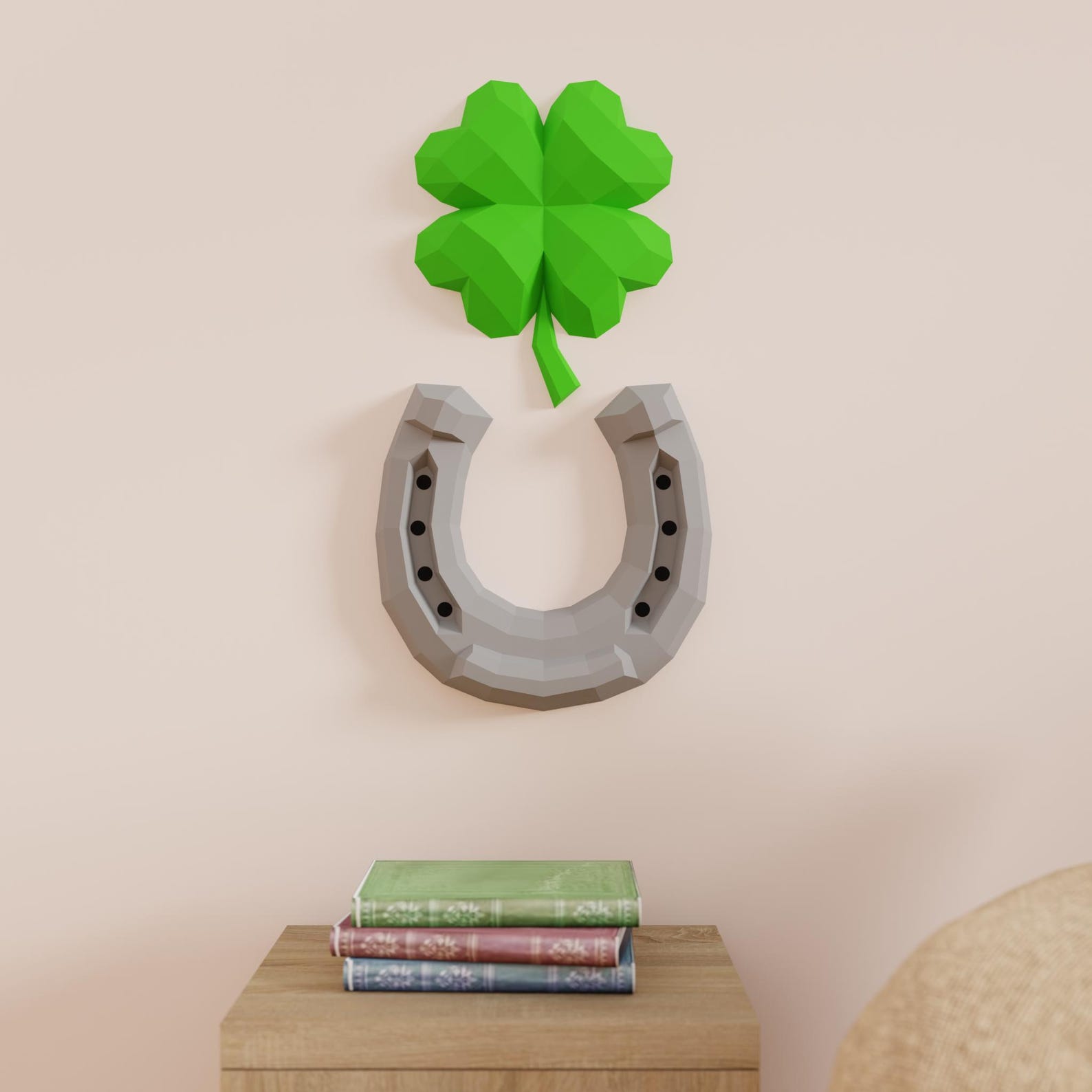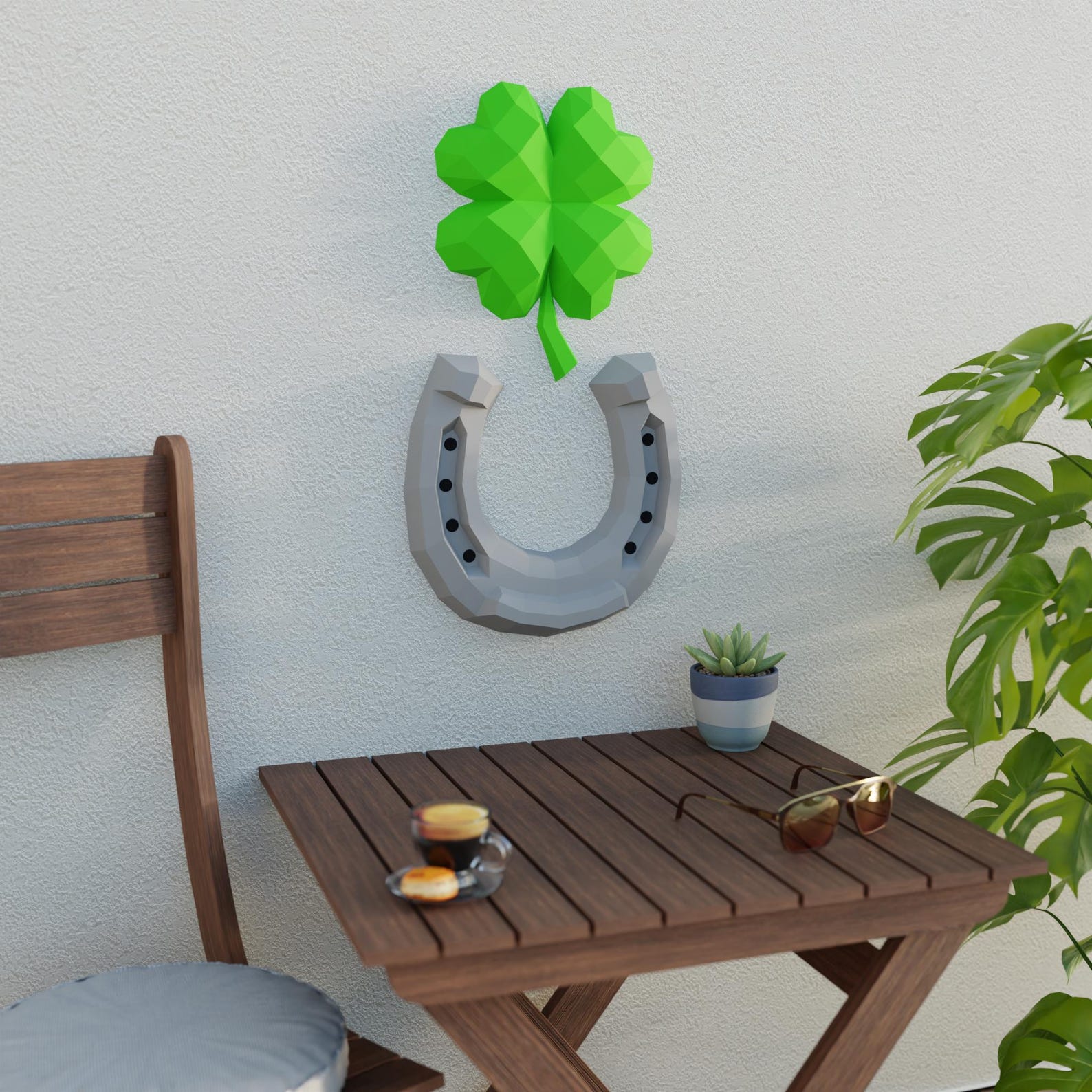 Appeso alla parete di casa, un simbolo di fortuna prende vita. Il ferro di cavallo, emblema di protezione e buon auspicio, si unisce al delicato trifoglio a quattro foglie, messaggero di speranza e prosperità. Insieme, danno forma a una decorazione unica che attira la fortuna e illumina i tuoi spazi. Con questo kit di papercraft 3D, potrai creare un duo armonioso che racconta una storia e aggiunge un tocco moderno e grafico alla tua casa.