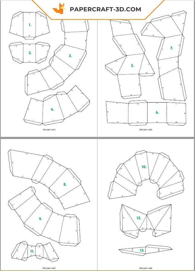 Questo modello è composto da dieci sculture, permettendo di realizzare una magnifica balena di carta. Le dimensioni finali sono di circa 50 cm di lunghezza, 20 cm di altezza e 15 cm di larghezza. La carta utilizzata è di alta qualità, assicurando una durata e una finitura impeccabile.