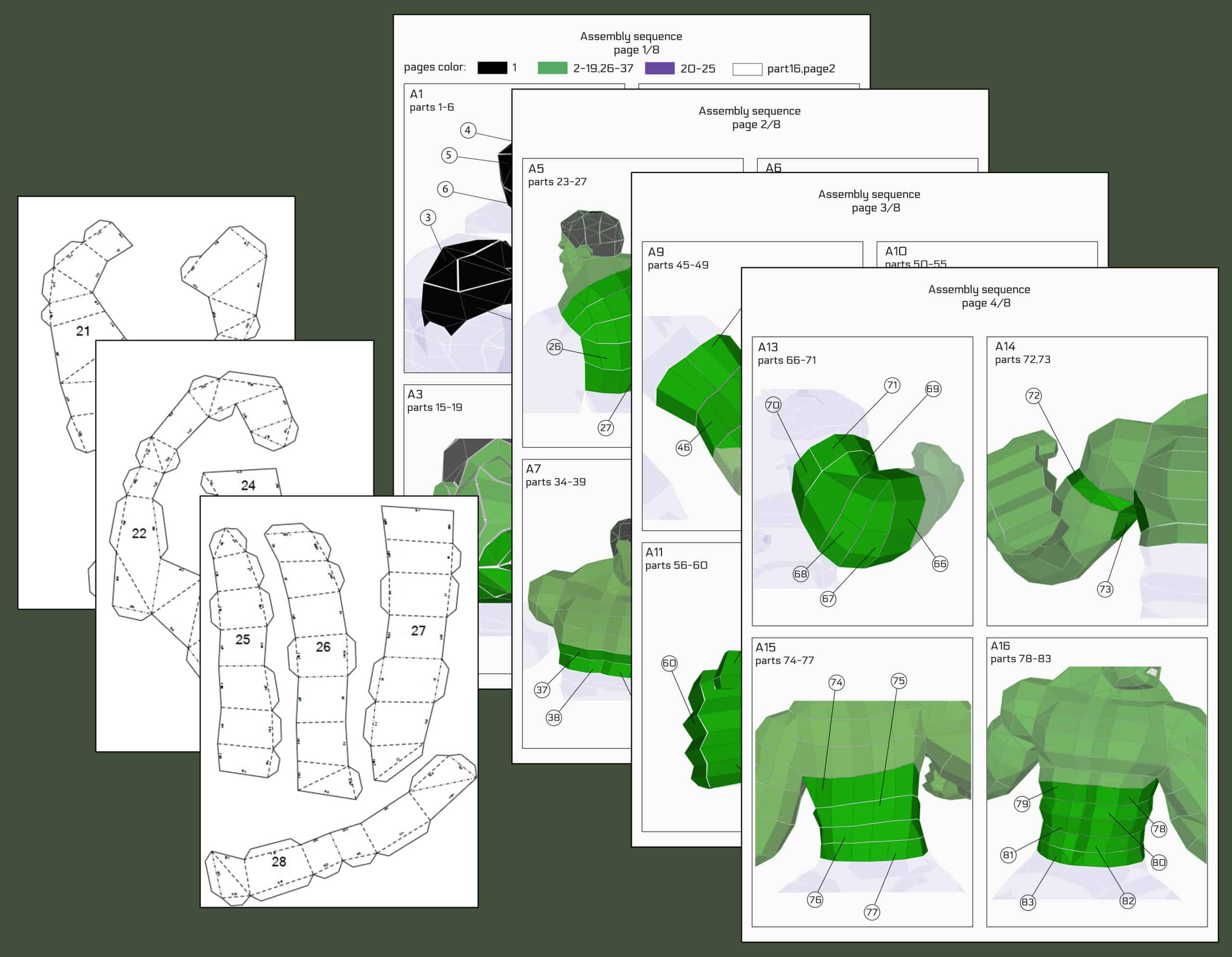 Il papercraft di Hulk in origami 3D include 37 fogli. Le dimensioni finali sono: altezza 78 cm, larghezza 56 cm, profondità 41 cm.