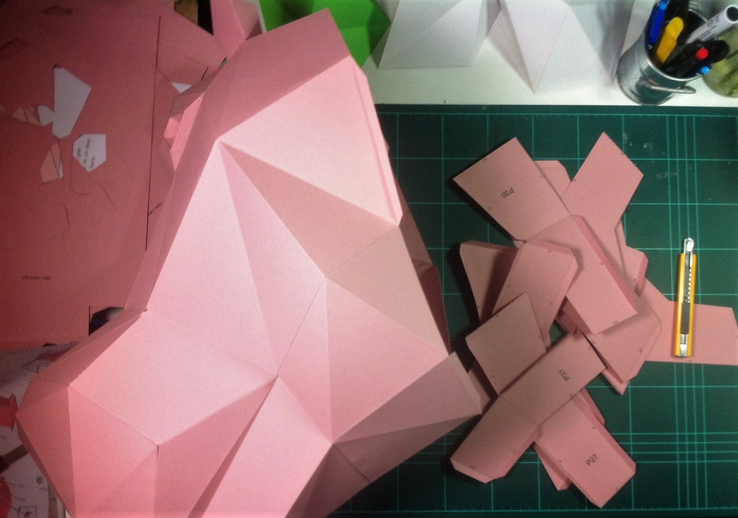 Con un’altezza di 43 cm, una larghezza di 34 cm e una profondità di 43 cm, questa testa di ippopotamo è progettata per attirare l’attenzione e stimolare le conversazioni. Il modello (PDF) è composto da 23 fogli e 36 pezzi. Utilizza carta colorata A4 160 – 300 gsm per garantire la robustezza necessaria a questa magnifica scultura.