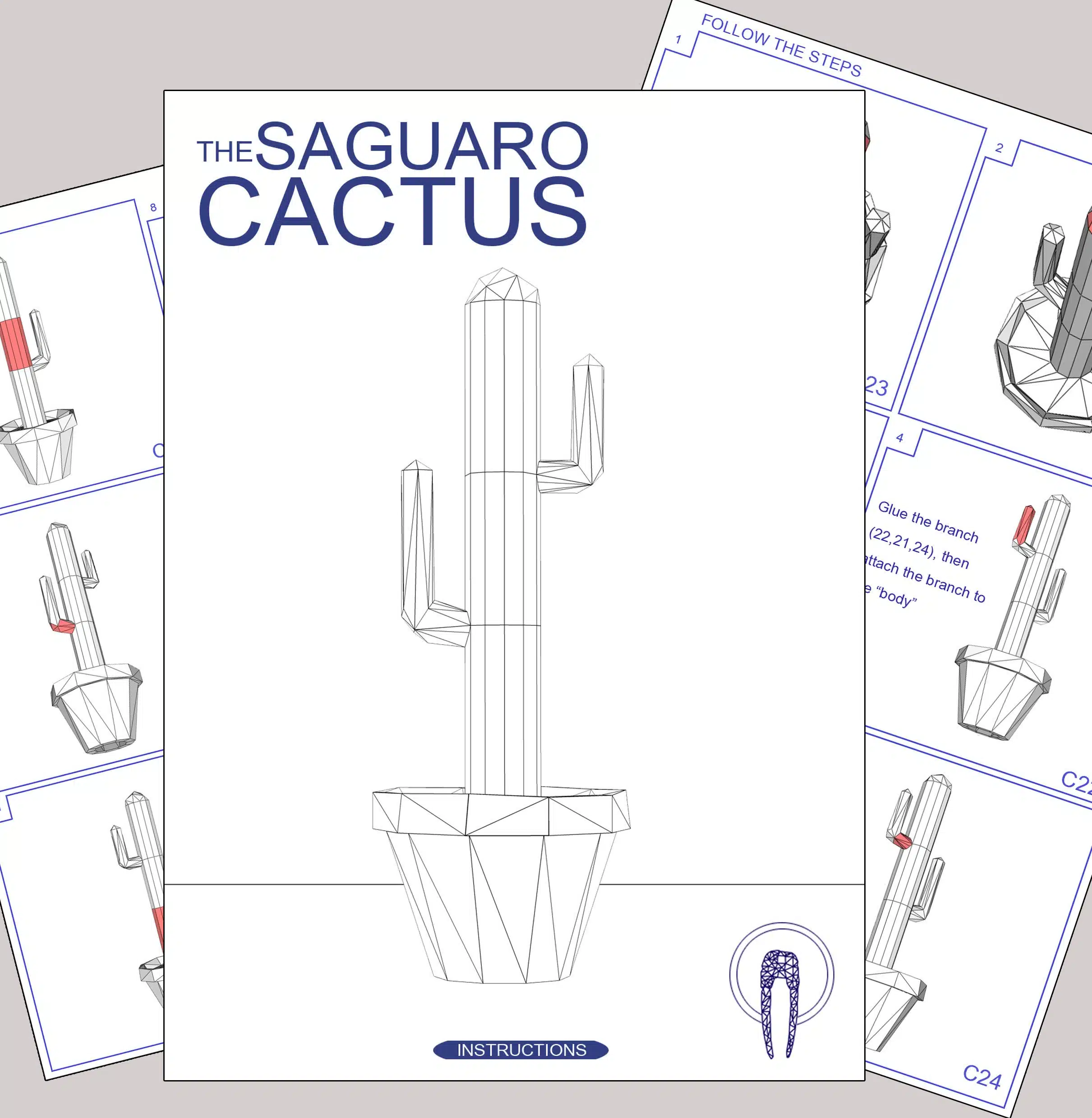 Questo progetto richiede circa sette ore per essere completato e necessita di 13 fogli A3 (29,7 cm x 42,0 cm) con una grammatura compresa tra 160 e 300g. Una volta terminato, il cactus Saguaro misura 100 cm di altezza e 25 cm di larghezza. Il modello è vergine, senza texture né colore, permettendovi così di aggiungere il vostro tocco artistico personale.