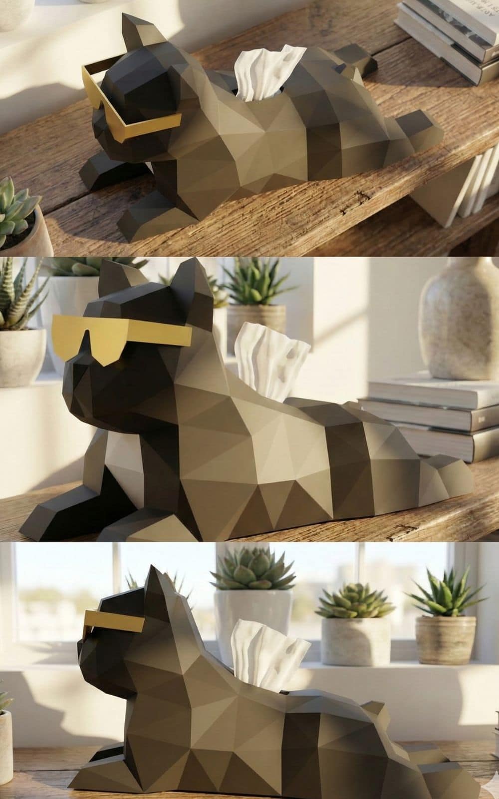 Fini les boîtes de mouchoirs en carton tristes qui traînent sur la table basse ! Adoptez ce Bulldog au look ravageur qui apportera une touche d’humour et de modernité à votre intérieur. Allongé nonchalamment, arborant fièrement ses lunettes de soleil dorées, il est prêt à vous tendre un mouchoir à tout moment depuis son dos. C’est la combinaison parfaite entre une sculpture design et un objet du quotidien revisité.