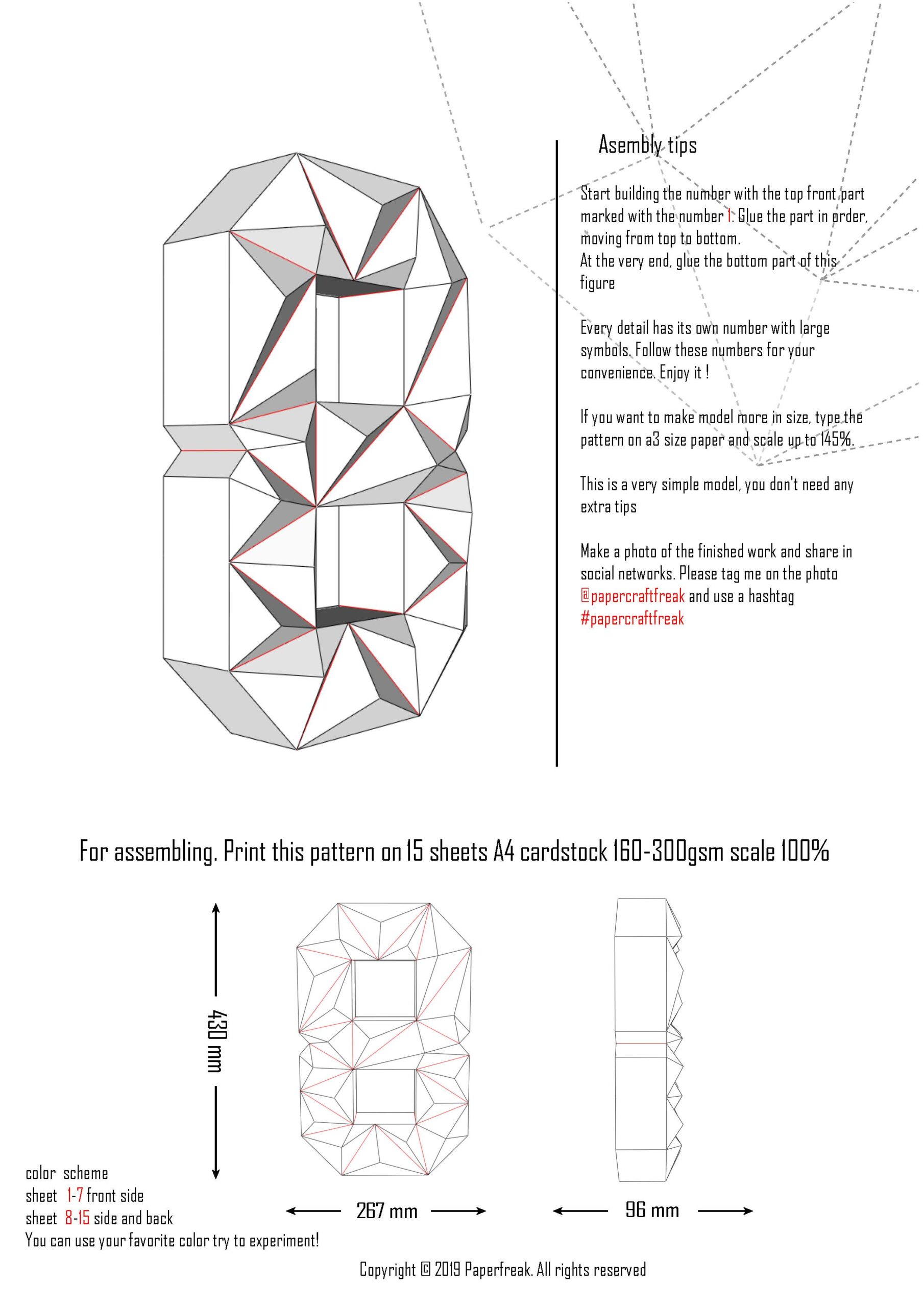 Le fichier PDF à imprimer comprend tout ce qu’il faut pour construire ce grand chiffre en papier à partir de 15 feuilles A4. Grâce aux instructions numérotées, l’assemblage est fluide et accessible à tous, même aux débutants.