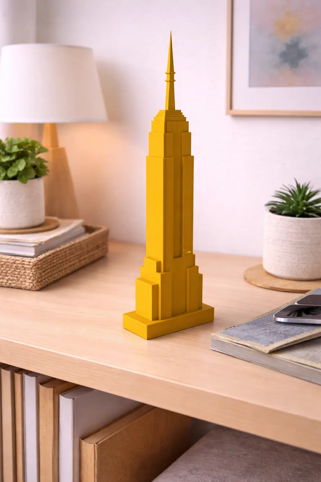 Grâce à son format fin, elle se place facilement sur une étagère, un bureau ou une console, même dans des espaces restreints. Elle fonctionne très bien seule, comme une petite sculpture d’architecture, mais peut aussi s’intégrer dans une composition avec des livres, une lampe, un cadre ou une plante, pour créer une ambiance contemporaine et équilibrée.