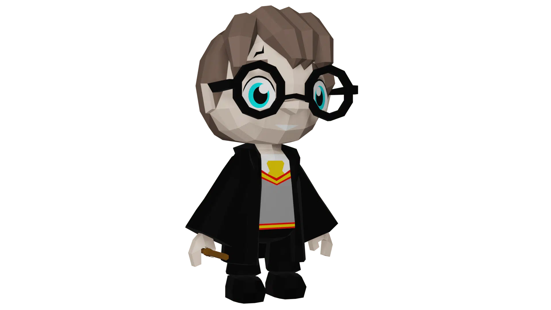 Une figurine low-poly au look iconique : grandes lunettes rondes, cape longue et petite baguette.