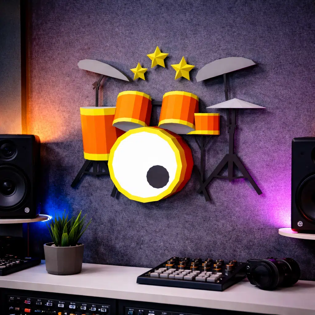 Posée sur un meuble ou intégrée dans un décor de studio, cette batterie en papercraft 3D prend vie comme une petite sculpture musicale. Les fûts orangés, cerclés de jaune, les cymbales stylisées et les étoiles suspendues composent une scène graphique joyeuse, presque ludique, qui attire immédiatement le regard. Chaque volume, chaque facette, capte la lumière et projette des ombres nettes, donnant une vraie présence à l’objet dans l’espace.