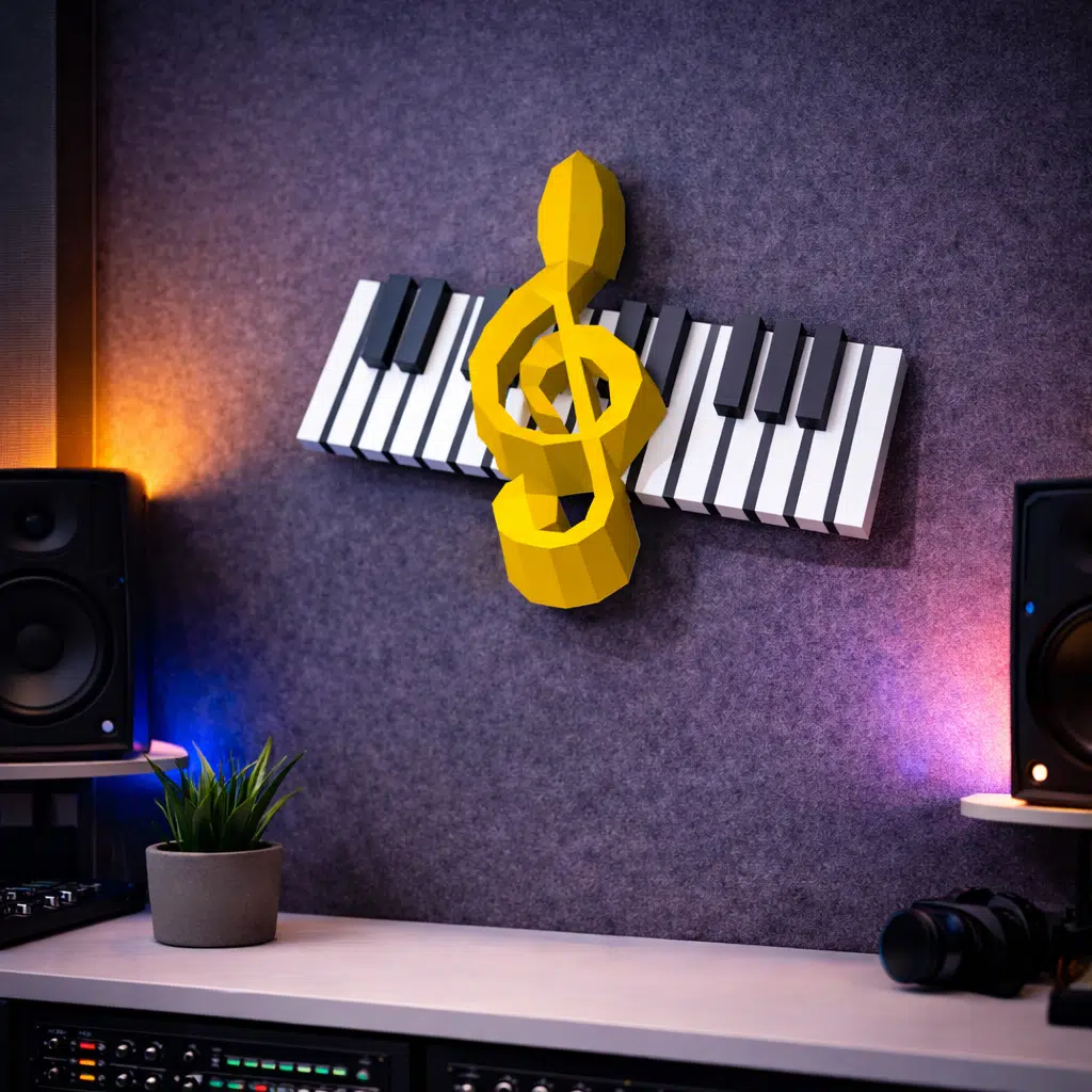 Grâce à son esthétique low poly, la clé de sol garde une allure contemporaine, nette et structurée. Le contraste entre le doré du symbole et le noir/blanc du clavier fonctionne dans des ambiances très variées : murs sombres, éclairages LED, mobilier minimaliste, intérieur pop ou légèrement industriel. Même dans une déco plus sobre, cette pièce devient un point focal sans surcharger la pièce, parce que sa géométrie reste lisible et élégante.